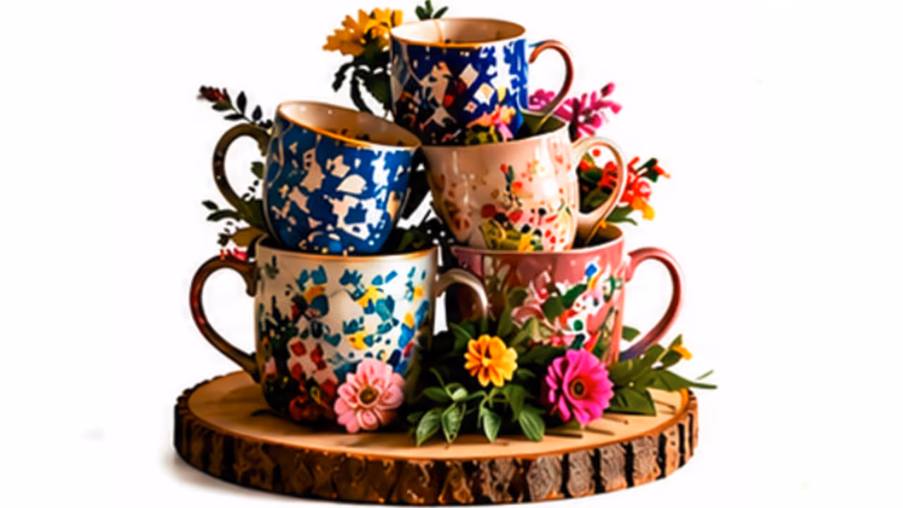 कई मग को एक के ऊपर एक सजाकर और उसमें फूल-पत्तियां जोड़कर आप एक यूनिक सेंटरपीस बना सकते हैं। यह डाइनिंग टेबल या पार्टी के लिए शानदार डेकोरेशन है।