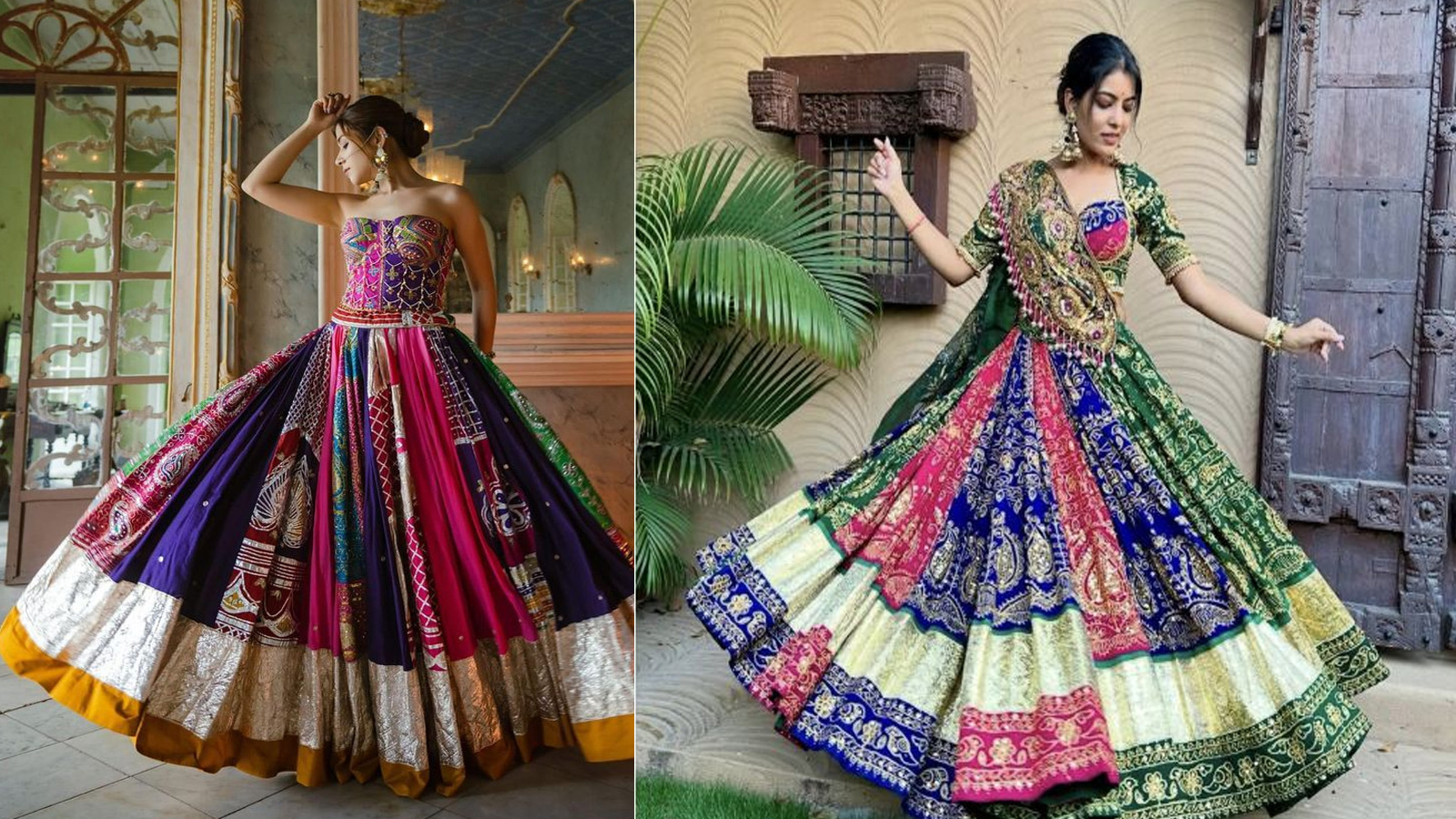 Dandiya Night Outfits: नवरात्रि के डांडिया नाइट के लिए मल्टीकलर, ग्रीन कॉटन प्रिंट और ऑरेंज गोटा वर्क वाले लहंगे स्टाइल में। इन्हें रंगीन ब्लाउज व हैवी ज्वेलरी के साथ ग्लैमरस दिखें।