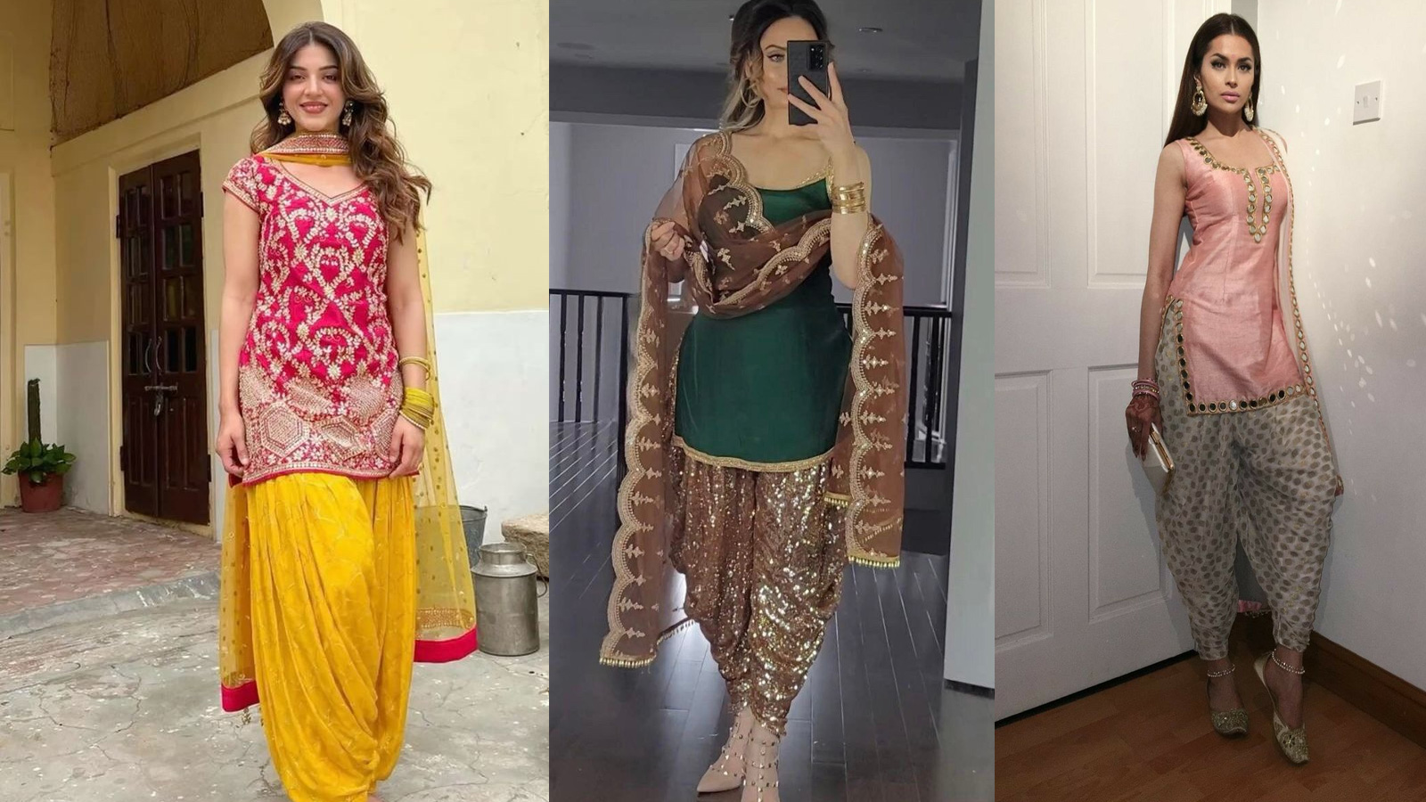 इस तस्वीर में तीन अलग-अलग पटियाला सूट डिजाइंस दिखाई दे रहे हैं, जो फेस्टिव और ट्रेडिशनल लुक के लिए परफेक्ट हैं। पहले सूट में ऑरेंज प्रिंटेड कुर्ती को येलो प्रिंटेड पटियाला के साथ पेयर किया गया है, जो बेहद स्टाइलिश और कैज़ुअल लुक देता है। दूसरे सूट में व्हाइट और ऑरेंज कॉम्बिनेशन की शॉर्ट कुर्ती के साथ ऑरेंज पटियाला और मैचिंग दुपट्टा है, जो क्लासिक और एलीगेंट लुक क्रिएट करता है। वहीं तीसरे सूट में गोल्डन पटियाला को ऑरेंज गोल्डन वर्क कुर्ती के साथ जोड़ा गया है, जो फेस्टिव और पार्टी वियर के लिए एकदम परफेक्ट चॉइस है।