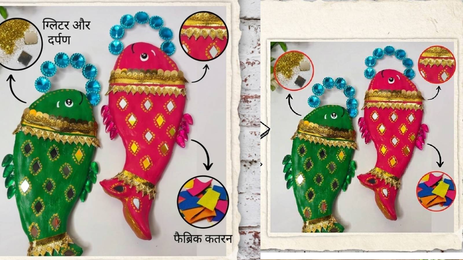चप्पल से डेकोरेटेड फिश बनाने के लिए आपको सबसे पहले चप्पल के ऊपर से स्ट्रेप को हटाना होगा। उसके बाद चप्पल को अच्छी तरीके से साफ करके पेंसिल से मछली का शेप मार्क कर काट लें। जब क्ले सूख जाए, तो उसके ऊपर अपनी पसंद का रंग भर सकते हैं। इसके बाद कलर की मदद से मछली की आंखें बनाएं और उसके बाद गोटा पट्टी से डेकोर करें। आप डिफरेंट शेप के मिरर का इस्तेमाल भी फिश को डेकोरेट करने के लिए कर सकते हैं। इसमें आगे की तरफ चूड़ी लगाकर आप उसे दीवार पर भी सजा सकते हैं। एक जोड़ी चप्पल का वॉल डेकोरेटिव पीस दीवार को चमका देगा।