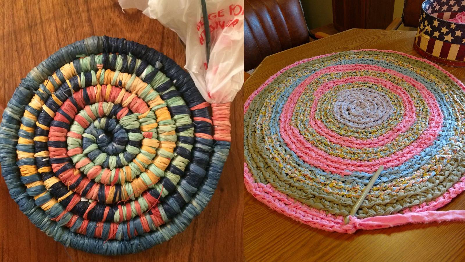 प्लास्टिक बैग की मदद से आप खूबसूरत मैट तैयार कर सकते हैं। यह मैट बैठने के लिए याद दरवाजे के लिए बेहतरीन ऑप्शन है। आपको इसके लिए अलग-अलग रंग की पॉलीथिन स्ट्रिप या पट्टी काटनी होंगी। प्लास्टिक की मैट मजबूत होती हैं और साथ ही वाटरप्रूफ भी। आप इसे बालकनी या किचन में इस्तेमाल कर सकते हैं। प्लास्टिक मैट घर में बनाने के लिए आप इंटरनेट से मदद ले सकते हैं।