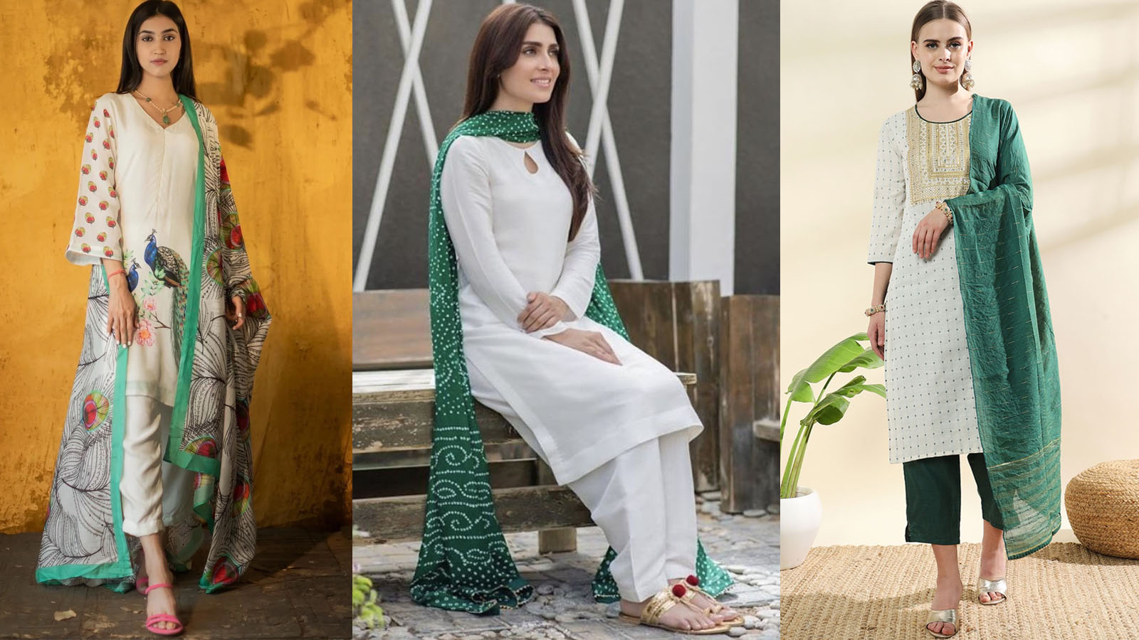 अगर आप सादगी और एलिगेंस का बैलेंस चाहती हैं तो व्हाइट कुर्ता-पैंट्स सेट के साथ ग्रीन दुपट्टा परफेक्ट है। यह मिनिमलिस्टिक लुक न केवल आपको मॉडर्न लगेगा बल्कि बेहद गरिमामयी भी दिखेगा। दुपट्टे में लाइट बॉर्डर या गोटा-पट्टी का टच इसे और खास बना सकता है।