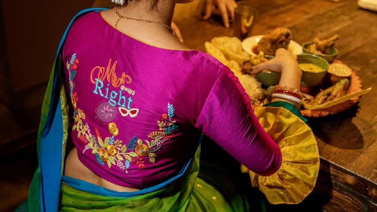 अगर सिल्क की प्लेन साड़ी पहन रही हैं तो उसके साथ सिंपल ब्लाउज पहनने के बजाय आप फ्लोरल एंब्रॉयडरी से सजे ब्लाउज में स्टेटमेंट लिखवा सकती हैं। ऐसे ब्लाउज में आपको टेलर से कहकर स्टेटमेंट लिखवाना पड़ेगा। आप चाहे तो अपने और अपने हस्बैंड का नाम भी एंब्रॉयडरी वर्क के साथ बैक ब्लाउज डिजाइन में ऐड करा सकती हैं।