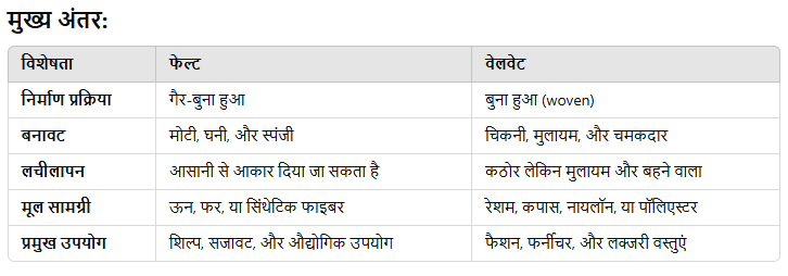 Felt vs Velvet big differences: फेल्ट मज़बूत और आकार देने में आसान होता है, जबकि वेलवेट मुलायम और शानदार होता है। दोनों के बीच के मुख्य अंतर जानें, जैसे बनाने की विधि, बनावट और उपयोग।