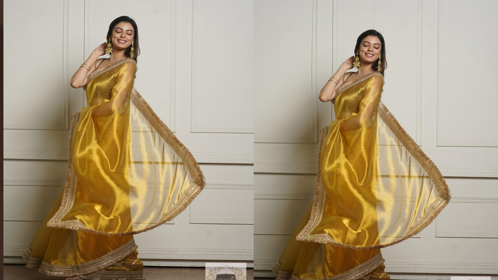 Golden Saree Designs: गोल्डन साड़ी पहनने के बाद काफी रॉयल और रिच लुक मिलता है। अगर आप इसके साथ गोल्ड ज्वेलरी खासकर इयररिंग्स पहन लेती हैं तो लुक में चार-चांद लग जाता है।
