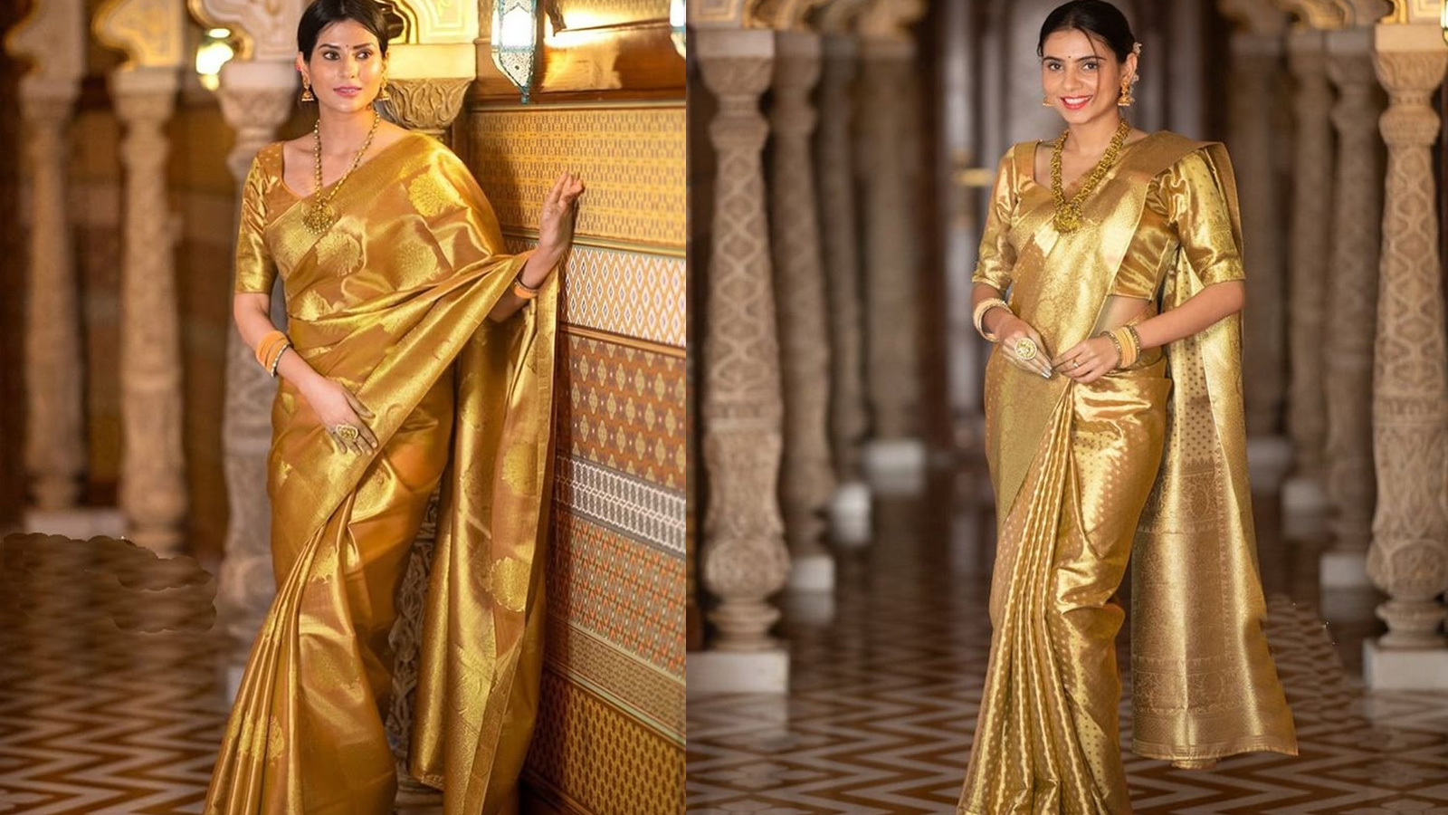 4. शाही लुक के लिए कांजीवरम गोल्डन साड़ी