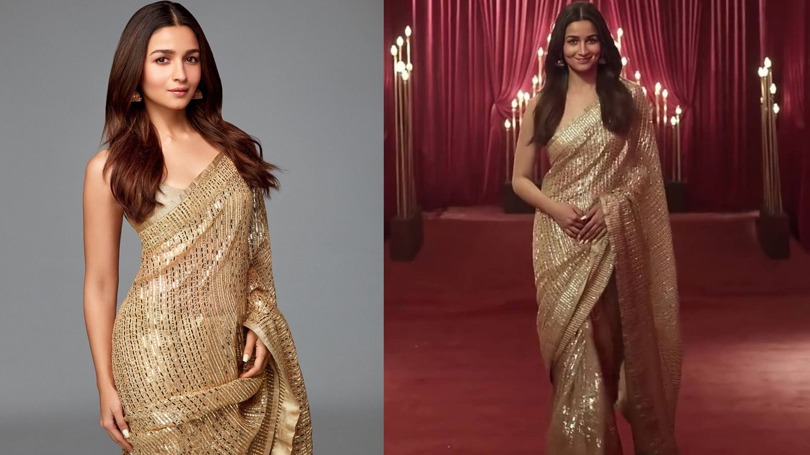 गोल्ड सीक्विन साड़ी का शिमरी लुक गोल्ड इयररिंग्स के ग्लो को डबल कर देता है। यह आउटफिट वेडिंग रिसेप्शन, पार्टी या नाइट फंक्शन के लिए बेस्ट है। ओपन हेयर के साथ गोल्ड झुमका या चांदबाली के साथ लुक को कंप्लीट कर सकती हैं।