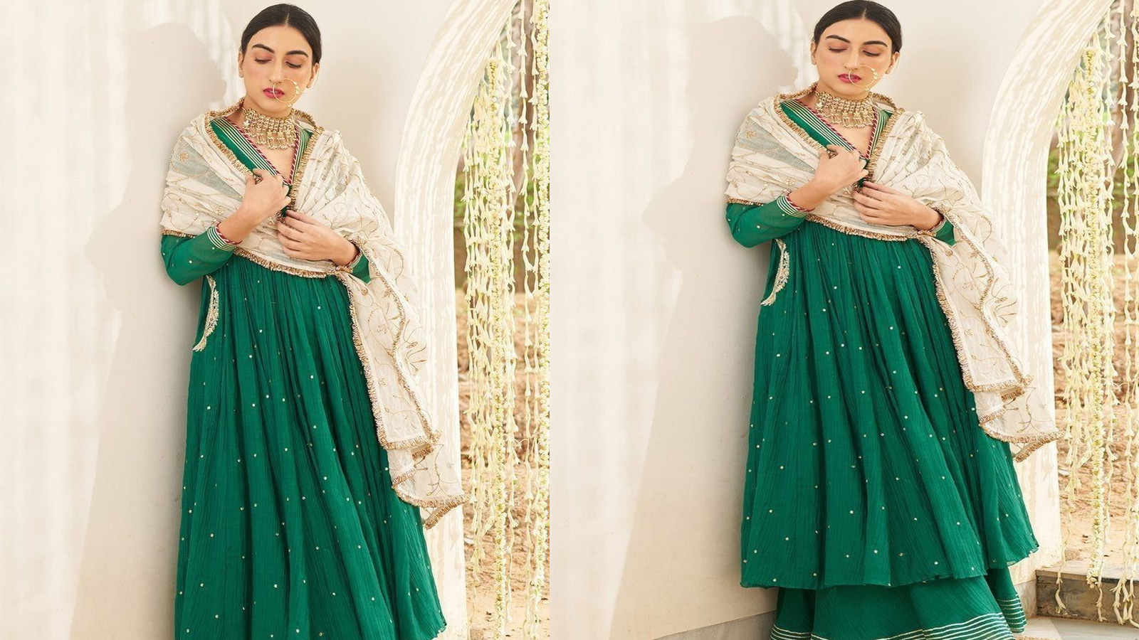 राजस्थानी बंदनी दुपट्टे का चार्म कभी आउट नहीं होता। रेड बंदनी दुपट्टा आपके ग्रीन सूट को एक पारंपरिक लेकिन बहुत ही फेस्टिव टच देगा। इसे आप झुमकों और पारंपरिक फुटवियर के साथ पेयर कर सकती हैं।