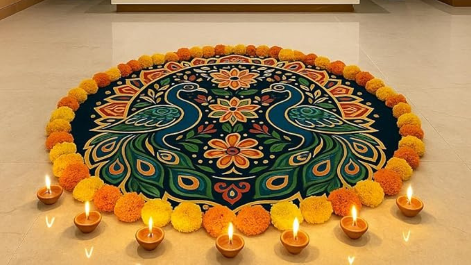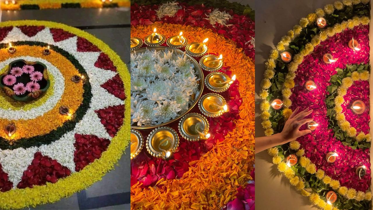 दिवाली पर ताजे फूलों से बनी रंगोली शुभता और खुशहाली लाती है। गेंदे, गुलाब, पत्ते, रीठा पत्ती और यहां तक कि तुलसी का इस्तेमाल कर सकते हैं। पहले चॉक से बेसिक सर्कल या ओम/दीये का आउटलाइन बनाएं और फिर अंदर रंग-बाय-रंग पंखुड़ियां जमाएं। बीच में दीया या कैंडल रखने से लुक और निखरता है।