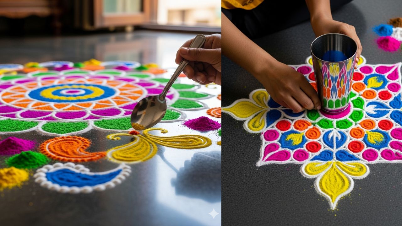 अगर आपके पास रंग नहीं हैं तो घर की चीजों से ही रंगोली तैयार की जा सकती है। जैसे—कच्चा चावल, हल्दी, लाल मिर्च पाउडर, चाय की पत्ती, सिंदूर या दालें। रंगों को अलग-अलग कटोरी में रखकर, उंगलियों की मदद से छोटे-छोटे पॉइंट या पैटर्न बनाएं।