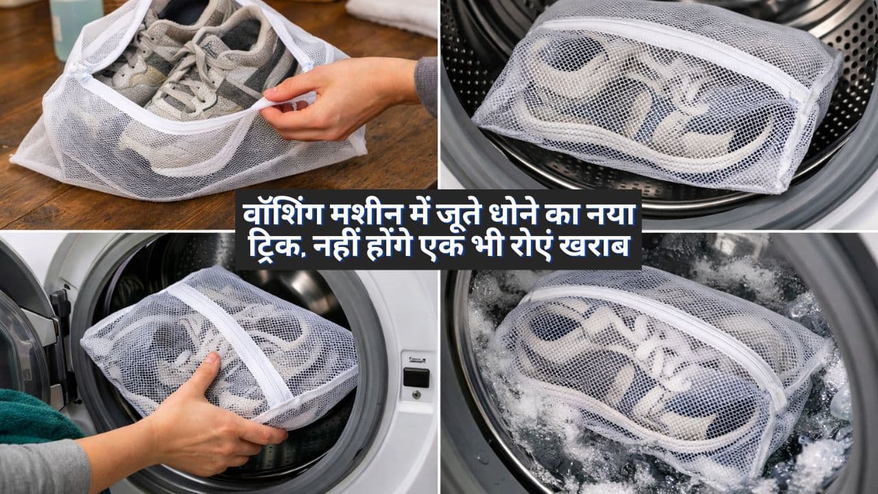 Sneaker Cleaning Hack: वॉशिंग मशीन में जूते धोने से पहले तले की गंदगी साफ करें, लेस अलग निकालें और जूतों को नेट बैग या कुशन कवर में डालें। जेंटल मोड और ठंडे पानी का इस्तेमाल करें। सही तरीके से सुखाने पर जूते नए जैसे चमकेंगे।