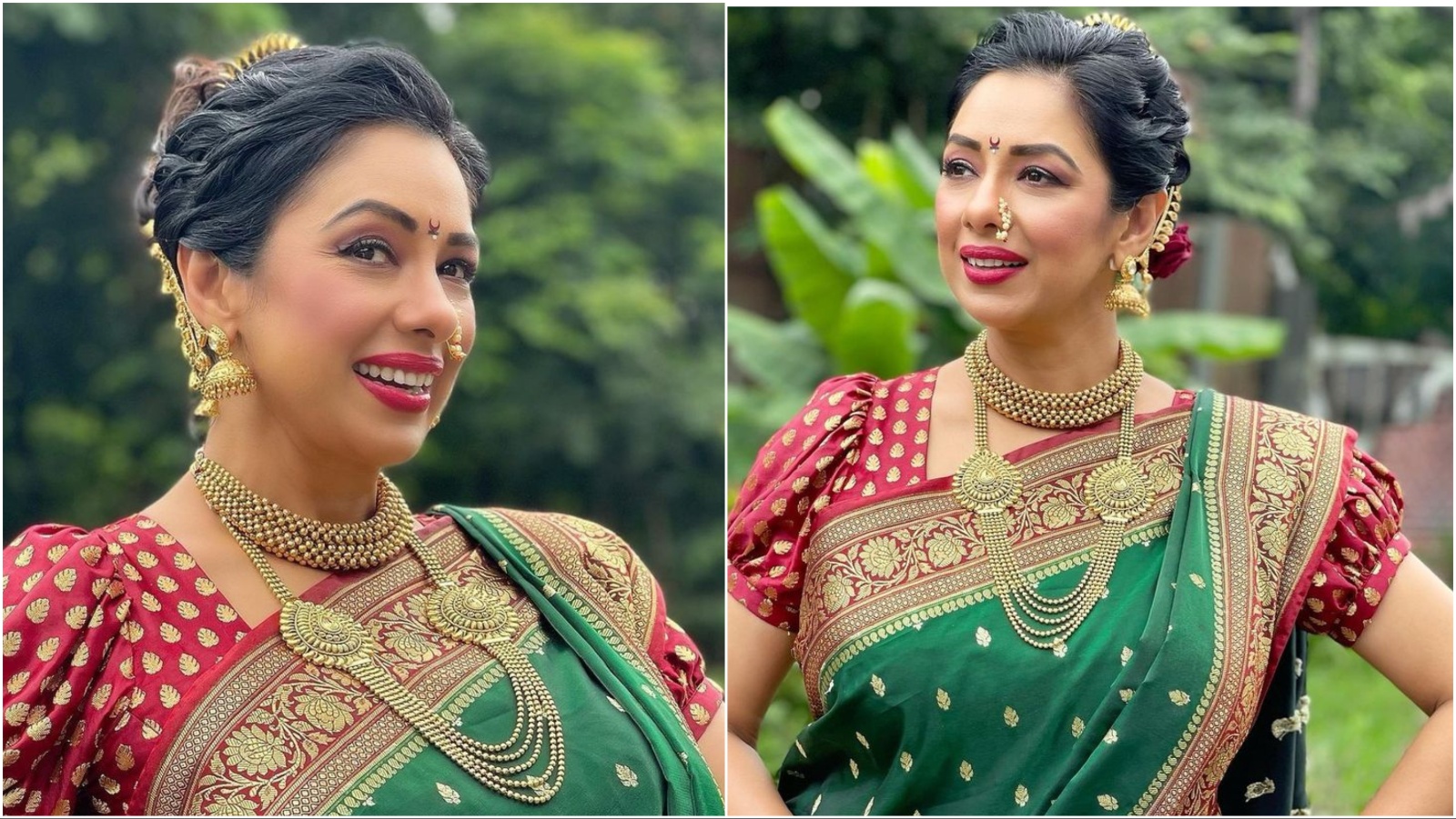 साड़ी से ज्यादा सिंदूर हाईलाइट करना चाहती हैं तो अनुपमा की ये दोनों हेयरस्टाइल बढ़िया रहेगी। एक तरफ मांग भरते हुए एक्ट्रेस ने पफ लो बन बनाया है और फ्रंट में दो फ्लीक्स दी हैं। जब भी इसे चुनें ज्वेलरी बिल्कुल मिनिमम रखें। वहीं, दूसरी तस्वीर में हाफ अप-हाफ डाउन हेयर स्टाइल है, जो मिनिमल लुक के लिए बेस्ट है।