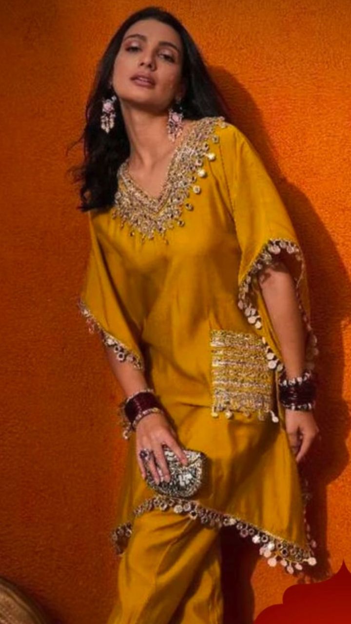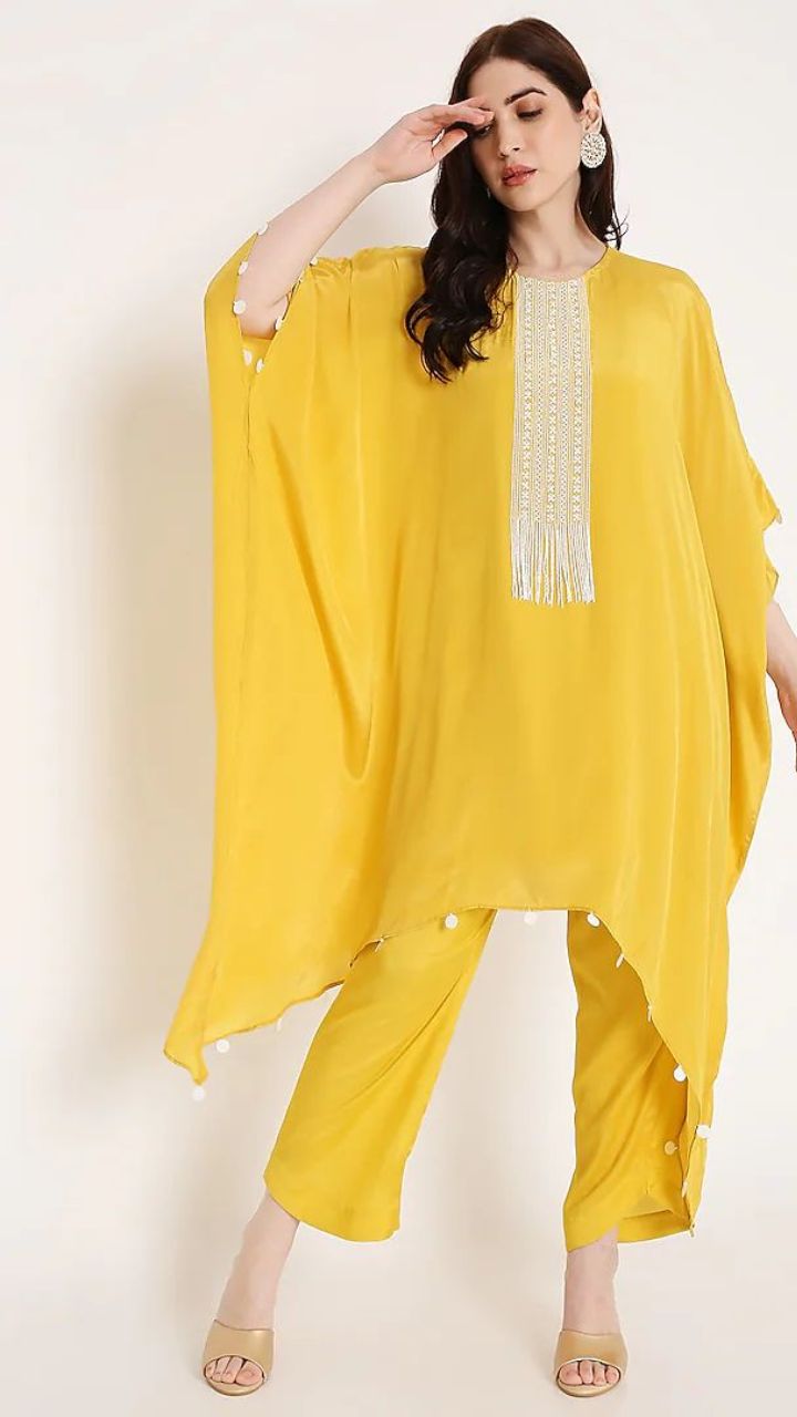 अगर आप पारंपरिक कफ्तान में एक मॉडर्न टच चाहती हैं, तो बेल्टेड अनारकली कफ्तान सेट बेस्ट रहेगा। यह आपकी बॉडी को एक खूबसूरत शेप देता है और ऑफिस के लिए परफेक्ट चॉइस है। इसे आप गोल्डन बेल्ट के साथ इसे एन्हांस करें। साथ में मिनिमलिस्ट वॉच और क्लासिक स्टड्स के साथ लुक को फिनिश करें।