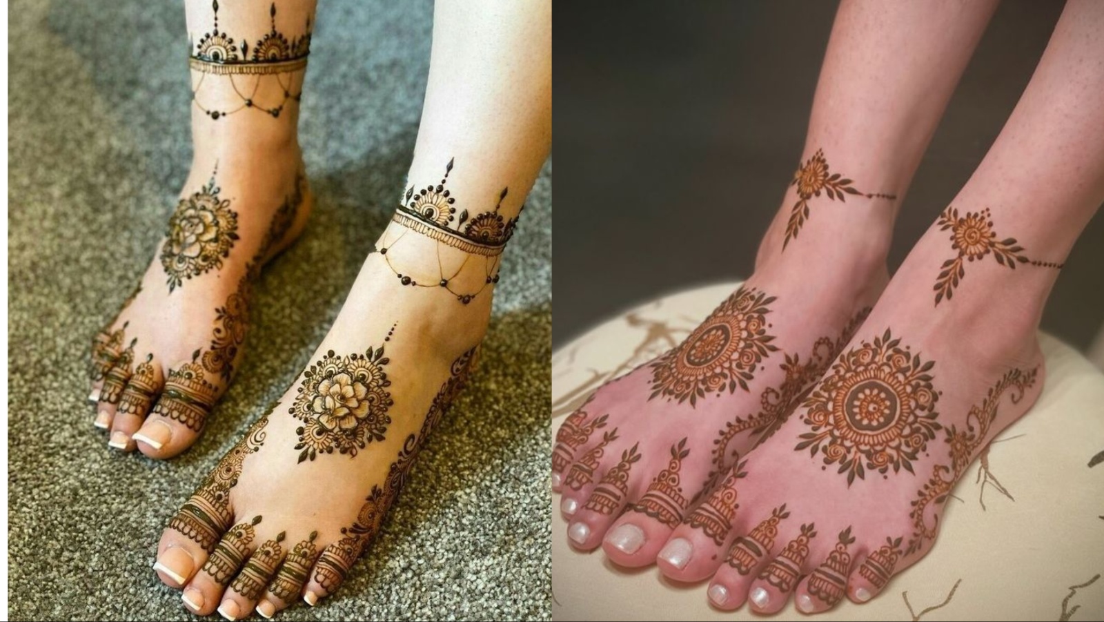 पैरों को सादगी के साथ एलीगेंट लुक देने के लिए आप इस तरह की मंडला स्टाइल मेहंदी की डिजाइन लगाएं। जहां पैरों के बीच में बड़ा सा फूल बनाया गया है। जबकि अपर साइड बेल और बूटे की मदद से पायल और उंगलियों में छोटे-छोटे फूल बने हैं, जो बिछिया का लुक दे रहे हैं। इसके अलावा पैरों को खूबसूरत लुक देने के लिए इंट्रीगेट रिंग जैसा पैटर्न भी बना सकती हैं।