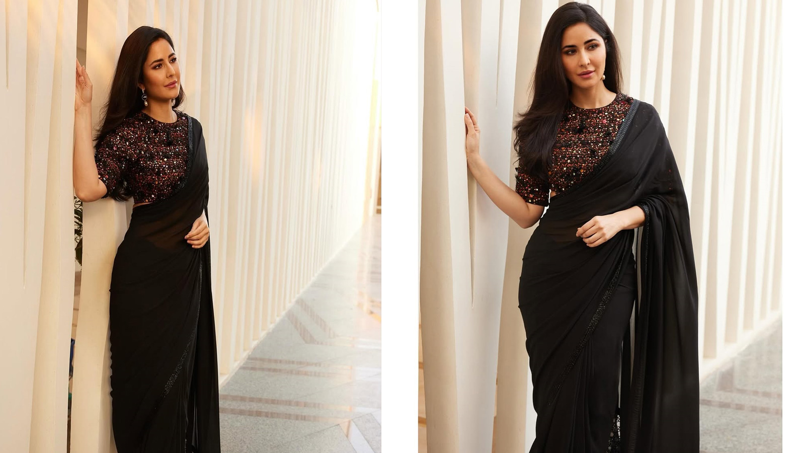 कैटरीना कैफ ब्लैक शिफॉन साड़ी में गॉर्जियस लग रही हैं। सिंपल साड़ी के साथ उन्होंने सीक्वेंस वर्क ब्लाउज पहना है। ब्लाउज की वजह से साड़ी की खूबसूरती उभरकर सामने आ रही हैं। तस्वीर में देख सकते हैं कि कैट ने रीविलिंग ब्लाउज की जगह डिजाइन को काफी सिंपल रखा है।