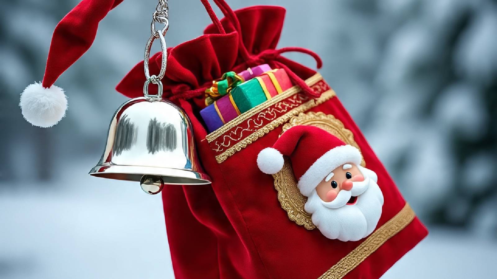 सांता क्लॉज के हाथ में गिफ्ट बैग या घंटी बहुत प्यारी लगती है। यह छोटी सी एक्सेसरी बच्चे के लुक को और भी मजेदार बनाती है और फोटो के लिए एकदम सही है। इससे बच्चे को असली सांता जैसा महसूस होता है।