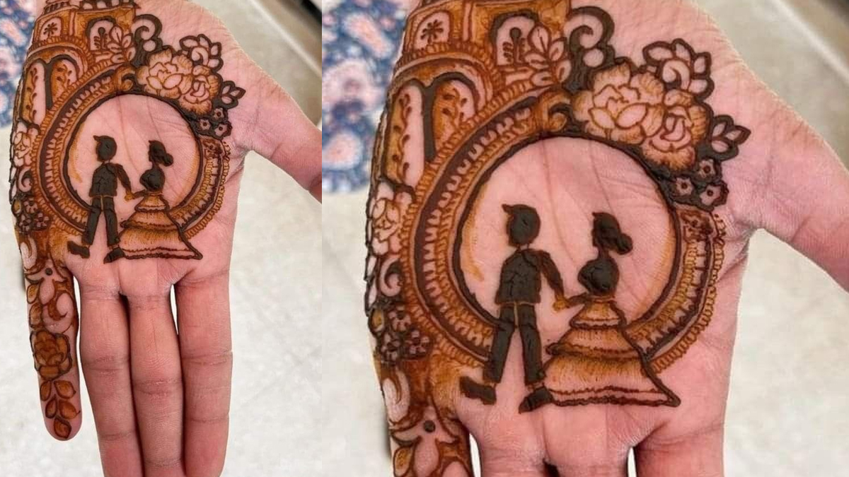 अगर दूल्हा अपने हाथ में क्रिएटिव मेहंदी लगाना चाहता हैं, तो इस तरह से दुल्हन का हाथ पकड़े हुए एक पोर्ट्रेट बनवा सकता हैं। इसके आजू-बाजू राउंड सर्किल बनाकर खूबसूरत सी फ्लोरल डिजाइन मेहंदी बनवाकर बेल डिजाइन फिंगर में लाकर इसे कंप्लीट करें।