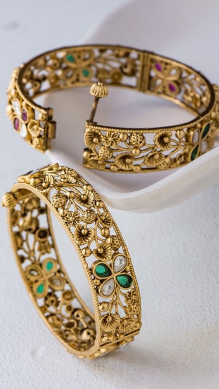 Rajwadi Bangles Designs: महिलाओं के लिए स्टाइलिश और आकर्षक बैंगल्स का कलेक्शन। रजवाड़ी कड़ा डिज़ाइन, स्टोन वर्क, झुमका स्टाइल और फ्लोरल मोटिफ वर्क से बने कड़ों से हाथों की शोभा बढ़ाएं।