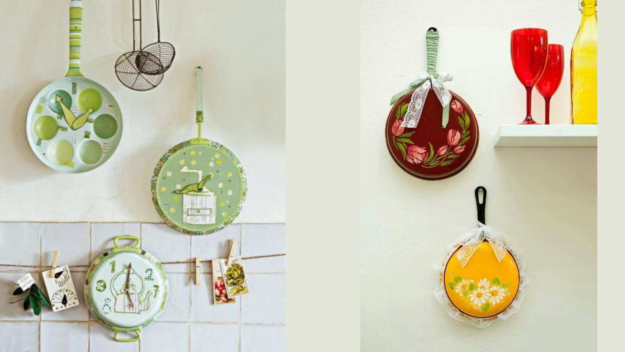 इडली मेकर से लेकर स्टील तवा, एल्युमिनियम पैन भारतीयों घर में होता है। आपके पास भी एक्स्ट्रा या पुराने बर्तन पड़े हैं तो उनमें थोड़ी सी क्रिएटिविटी दिखाते हुए कलरफुल आर्ट बनाएं। इसके लिए दीवार के पेंट के अनुसार कंट्रास्ट रंग का इस्तेमाल करें। साथ में मैचिंग बोतल, ग्लास और रिबन संग डेकोरेट कर दें। ये किचन ही नहीं बल्कि लिविंग रूम और बालकनी को एस्थेटिक-कोजी वाइब देने के लिए बेस्ट DIY डेकोर है।