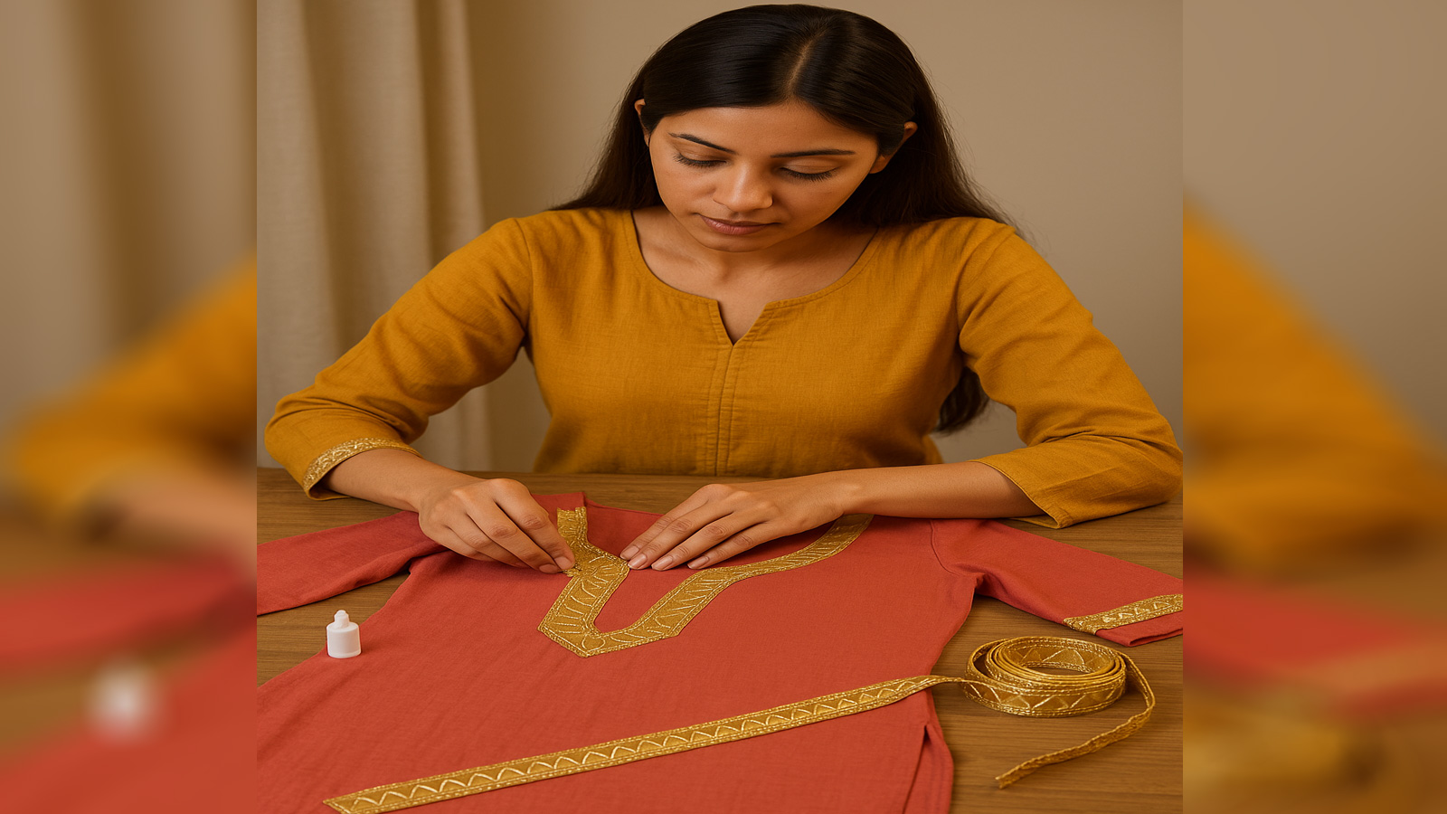 कुर्ती की बांहें अक्सर अनदेखी रह जाती हैं, लेकिन इन्हें सजाकर लुक को और भी खास बनाया जा सकता है। दो पतली गोटा पट्टियां काटें और दोनों आस्तीनों पर नीचे की ओर चिपका दें।