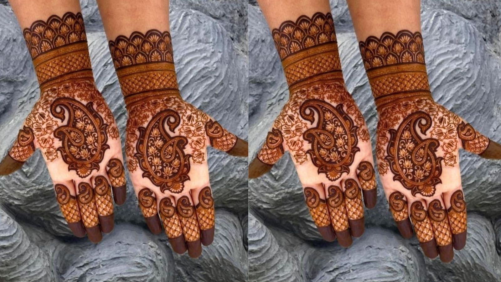 कैरी मेहंदी की खूबसूरत डिजाइन आजकल काफी ट्रेंड में है। इस तरह हाथों में बड़ी सी कैरी बनाकर आप उसे मंडला या फिर थ्रीडी पैटर्न में खूबसूरती से डिजाइन दे सकती हैं। मेहंदी की ये सुंदर डिजाइन चौड़ी और भरी हुई हथेली पर खूब जचेगी। ये डिजाइन मिनिमल और मॉर्डन लुक में हाथों कीं सुंदरता को खूब बढ़ाएगी। कैरी मेहंदी पूरे हथेली पर लगाकर आप इसकी सुंदरता अपने हथेली के फ्रंट साइड पर लगाकर बढ़ा सकते हैं।