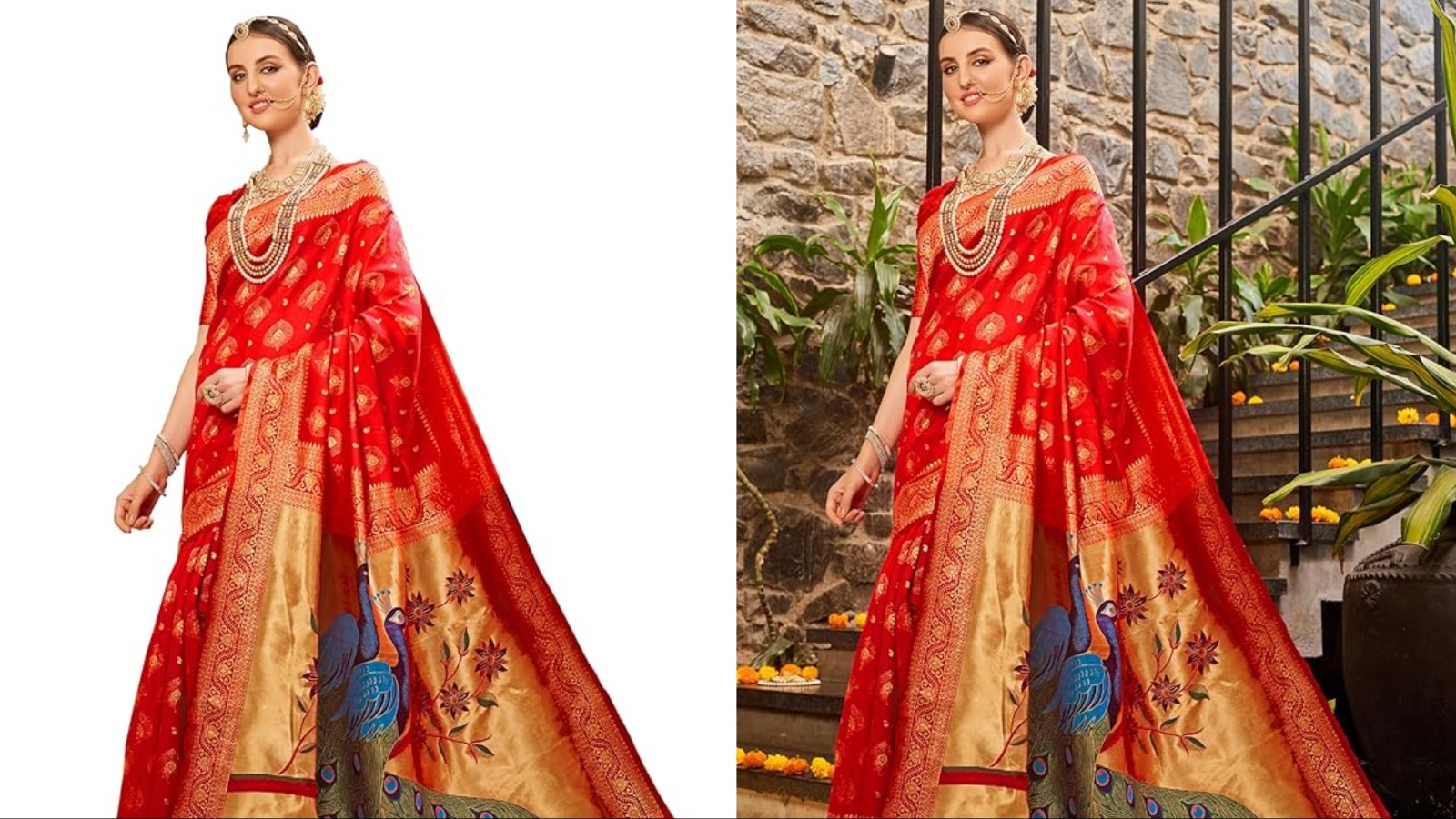 लाल रंग की ये पैठणी साड़ी करवा चौथ और दिवाली के लिए बढ़िया विकल्प है। मैरिड वुमन पर ऐसी साड़ी बहुत सुंदर लगती है। इसे सिल्क ब्लेंडर फैब्रिक पर तैयार किया गया है, जिस वजह ये लाइटवेट होगी। साड़ी के पल्लू में बना मोर इसकी शान और बढ़ा रहा है। अगर आप ट्रेडिशनल+फैशनेबल एक साथ दिखना चाहती हैं तो इसे चुन सकती हैं। अमेजन पर इसे साड़ी को 79% डिस्काउंट के साथ 419 रुपए में खरीदा जा सकता है। डिटेल देखने के लिए यहां क्लिक करें।