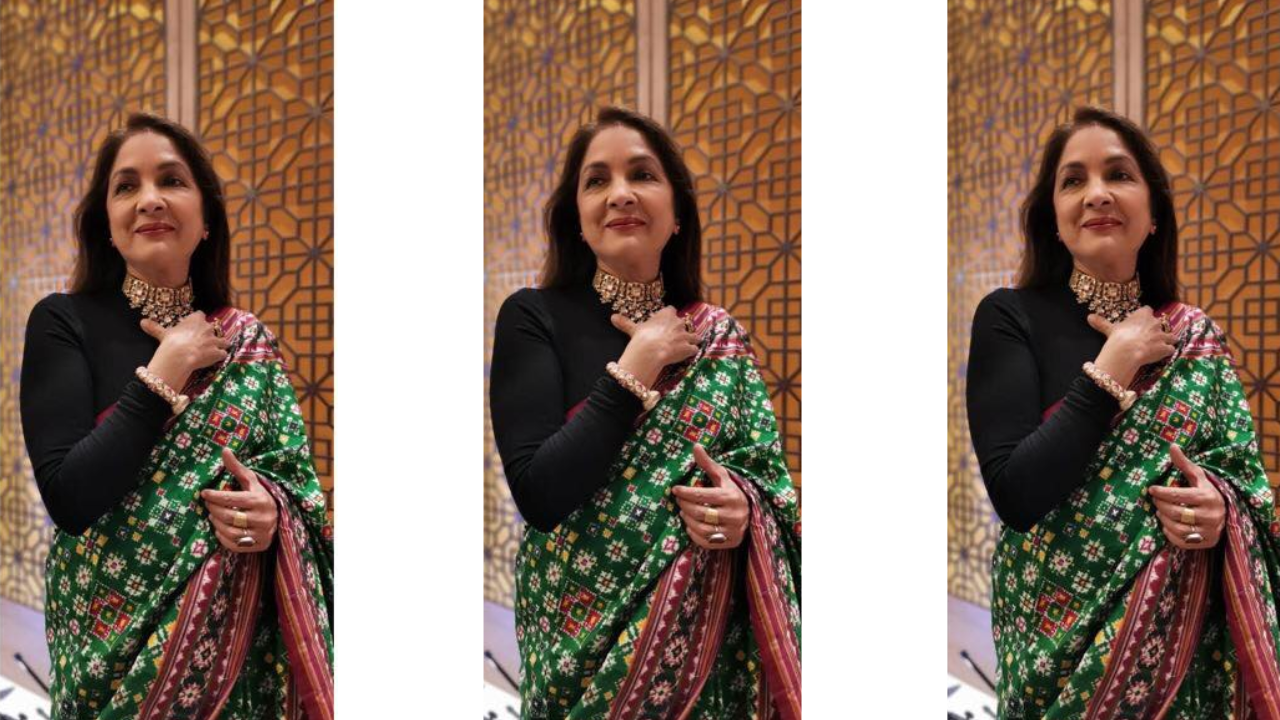 नीले रंग की साड़ी के साथ नीना गुप्ता का कंट्रास्ट ब्लाउज प्यारा लग रहा है। यहां पर स्मॉल स्लीव के साथ वी नेक डीप है। आप ऐसा लुक किसी भी साड़ी के साथ बोल्ड स्टेटमेंट पा सकती हैं।