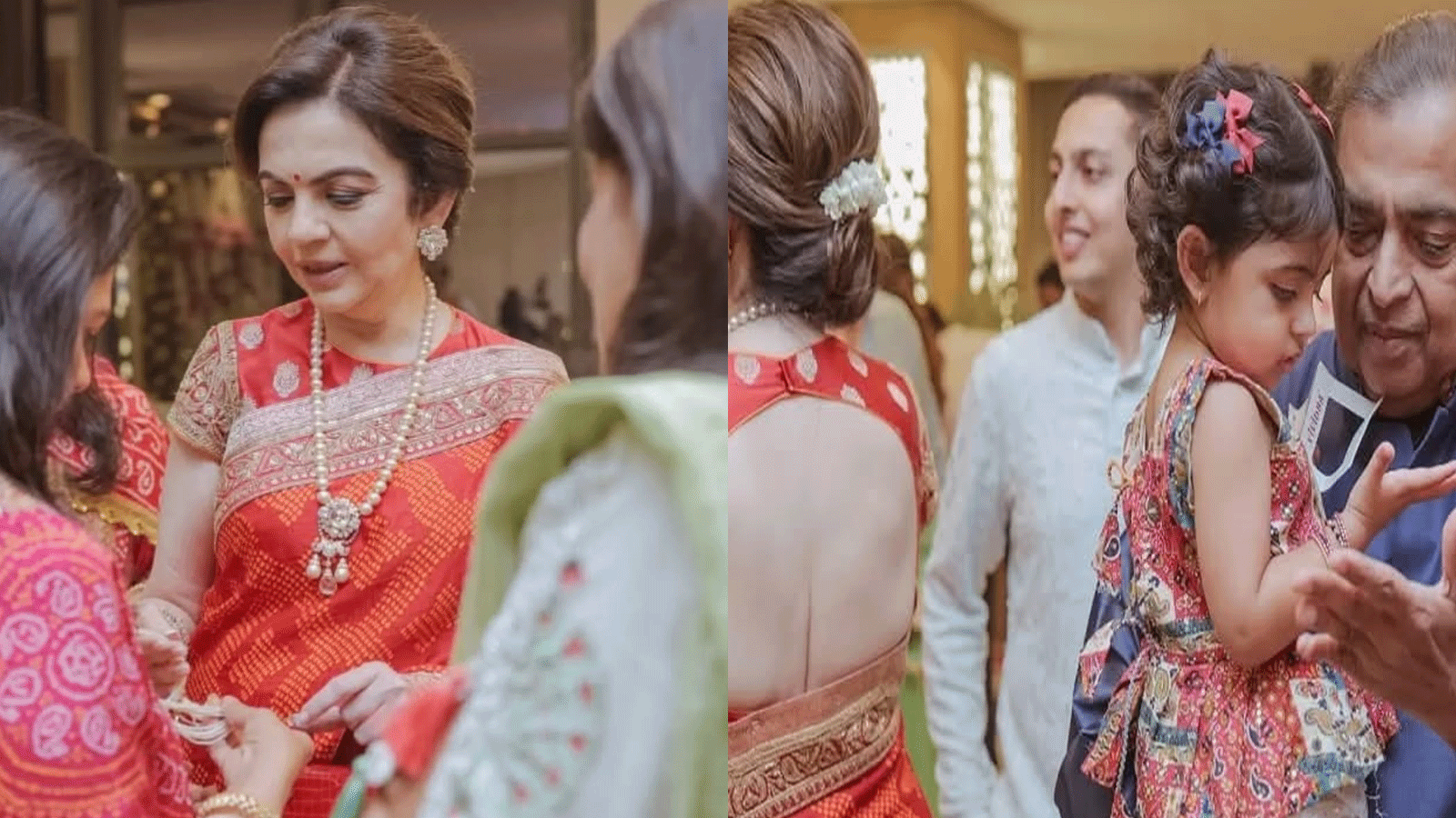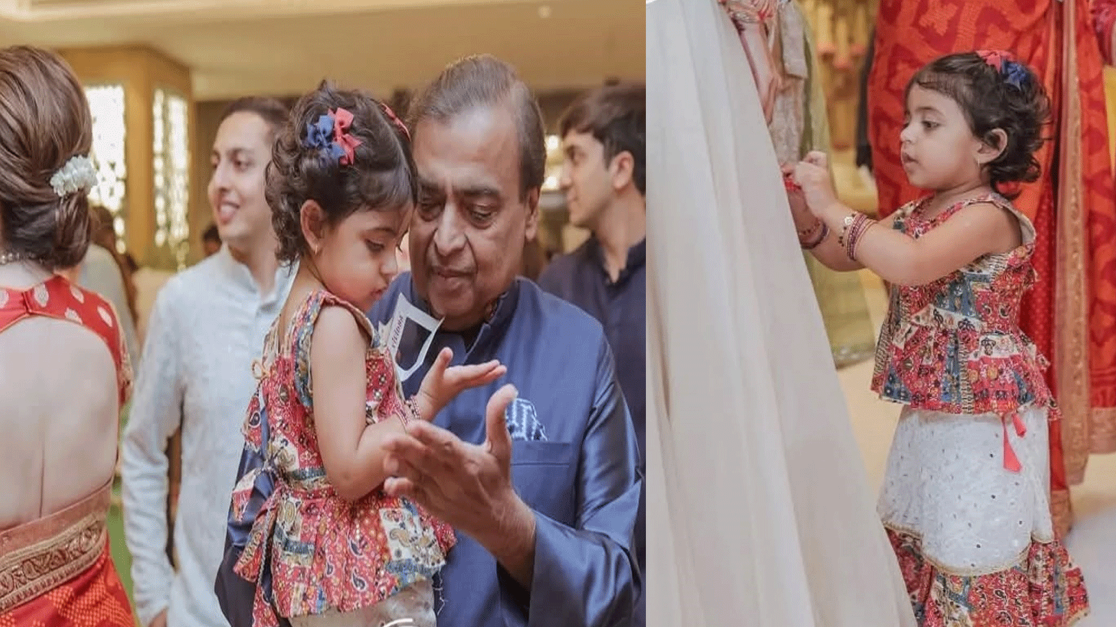 मुकेश अंबानी ने नेवी ब्लू सिल्क कुर्ता और मैचिंग हाफ नेहरू जैकेट पहनकर क्लासिक लुक अपनाया। वहीं उनकी गोद में खेल रही श्लोका और आकाश अंबानी की बेटी ने लहंगा चोली पहन रखी थी। वो बहुत ही क्यूट दिख रही थीं। दो चोटी में रंग-बिरंगे रिबन उनके लुक को और भी प्यारा बना रहे थे।
