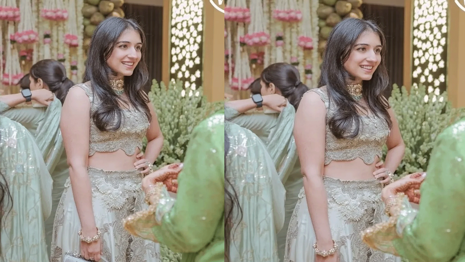 दूसरी ओर, राधिका मर्चेंट ने सीक्विन कढ़ाई और भारी डिटेलिंग से सजे बेज क्रॉप्ड ब्लाउज में एक कंप्लीट डीवा लुक अपनाया। उन्होंने इसे मैचिंग पलाजो पैंट के साथ पहना, जो ग्लैमर और परंपरा के बीच सही बैलेंस बनाते हुए नजर आए। वो इस ड्रेस में अपना फ्लैट बेली फ्लॉन्ट कर रही थीं। इस ड्रेस लुक को पूरा करने के लिए अंबानी की छोटी बहू ने पन्ना चोकर नेकलेस, सॉफ्ट ग्लैम मेकअप,बीच से अलग किए गए बाल किए थे।