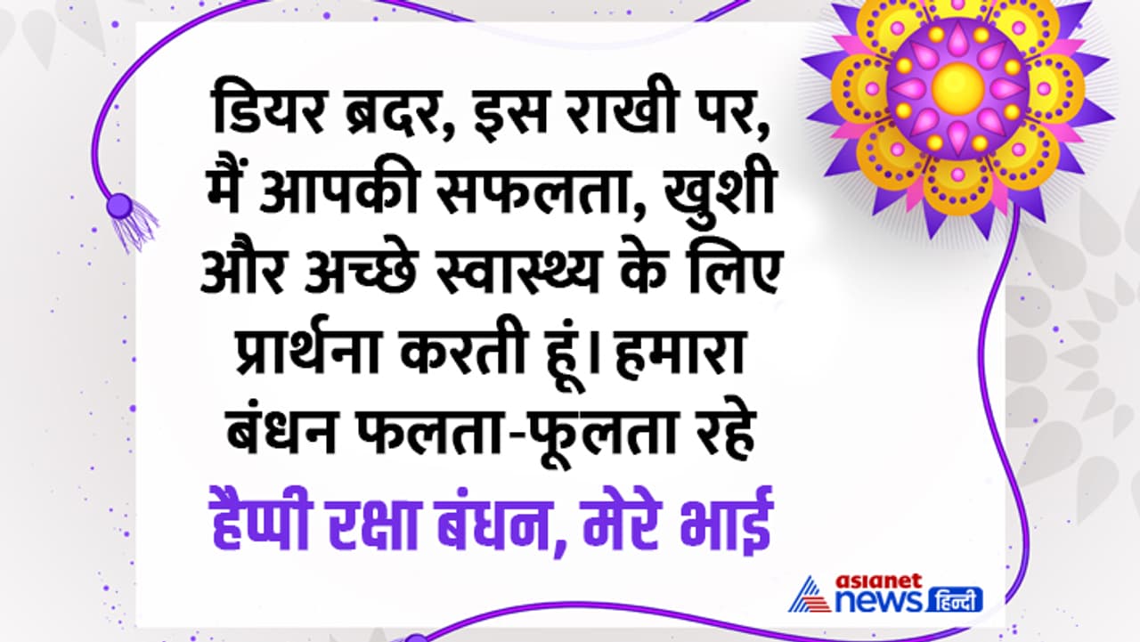 डियर ब्रदर, इस राखी पर, मैं आपकी सफलता, खुशी और अच्छे स्वास्थ्य के लिए प्रार्थना करती हूं। हमारा बंधन फलता-फूलता रहे। हैप्पी रक्षा बंधन, मेरे भाई!