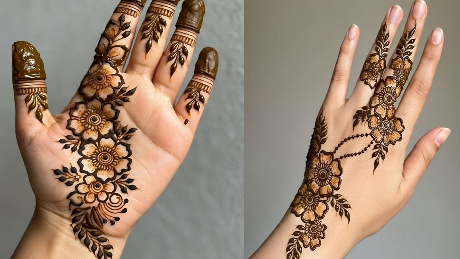 यह मेहंदी डिजाइन पतली लाइनिंग और फूलों की बेलों से बनी होती है। इसमें हाथ का सिर्फ एक हिस्सा कवर होता है, जिससे यह हल्का और ट्रेंडी लगता है। बेस्ट बात ये है कि मेहंदी डिजाइन जल्दी बन जाती है। कम मेहंदी में भी ये आकर्षक दिखती है।