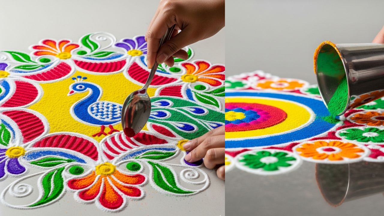 Easy Rangoli Design Hacks: भारत में त्योहारों की सजावट में रंगोली का अपना एक खास महत्व है। घर के आंगन और दरवाजे पर बनाई गई रंगोली न केवल घर की सुंदरता बढ़ती है बल्कि इसे शुभता और सकारात्मक ऊर्जा का प्रतीक भी माना जाता है। अक्सर लोग सोचते हैं कि परफेक्ट और सुंदर रंगोली बनाने के लिए बहुत मेहनत और प्रोफेशनल स्किल की जरूरत होती है, लेकिन सच यह है कि कुछ सामान्य किचन के बर्तन जैसे चम्मच, कटोरी और गिलास की मदद से आसानी से सुंदर और सरल रंगोली डिजाइन बना सकते हैं। गिलास, कटोरी और थाली से डिजाइन बिगड़ने की संभावना कम हो जाती है और हर बार एक जैसी सटीक गोलाई या डिजाइन बनती है।