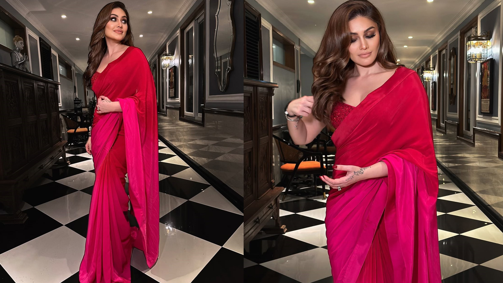 शेफाली ने ड्यूल-टोन रेड एंड पिंक साड़ी पहनी है, जिसे उन्होंने शिमरी रेड ब्लाउज़ के साथ मैच किया है। यह लुक सॉफ्टनेस और बोल्डनेस का खूबसूरत मेल है। फ्लोई फैब्रिक और कांट्रास्टिंग कलर्स इस लुक को और भी अट्रैक्टिव बनाते हैं।