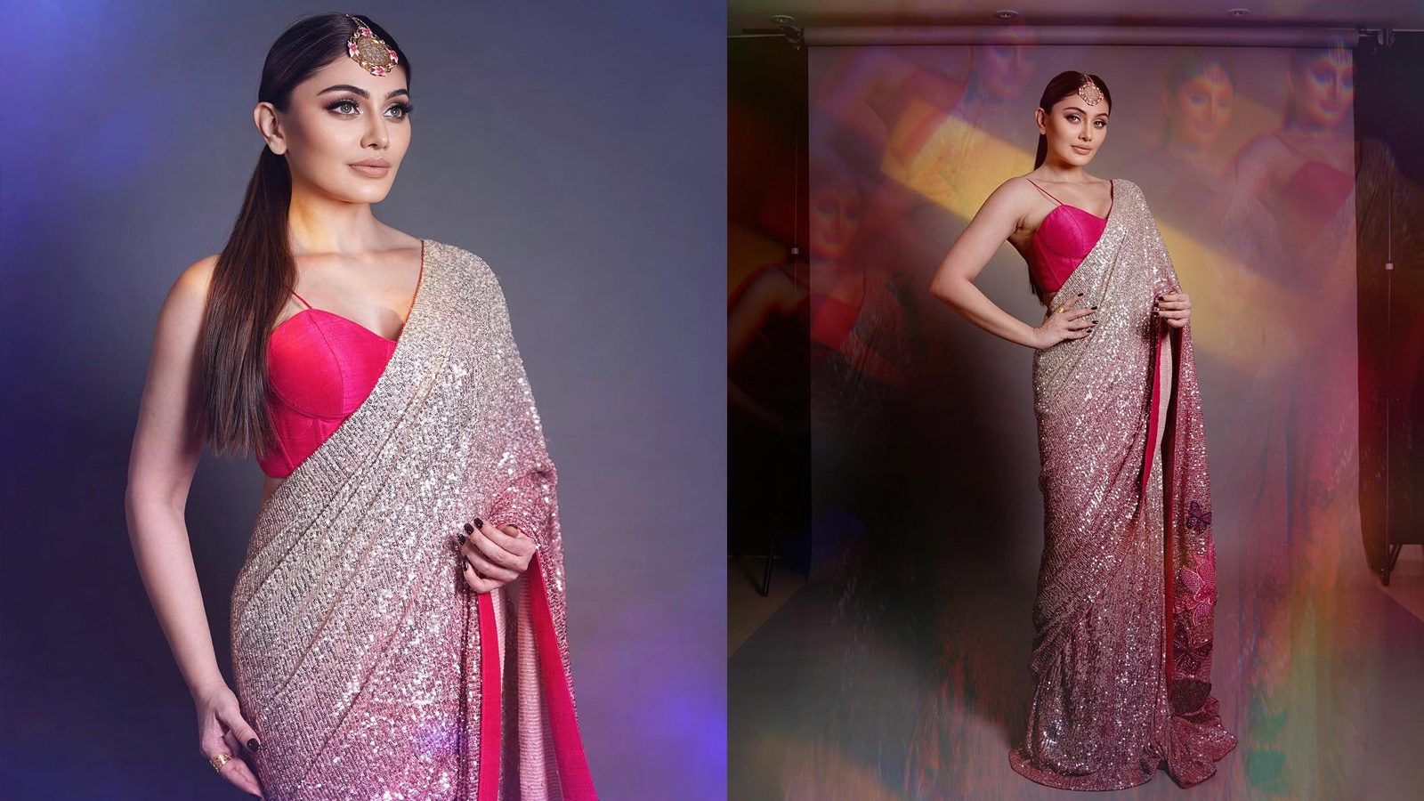 शेफाली पिंक एंड सिल्वर टोन सीक्वेंस साड़ी में बहुत ही सुंदर लग रही हैं। उन्होंने इस साड़ी को पिंक स्ट्रैप्स ब्लाउज के साथ पहना है। यह साड़ी हल्के फैब्रिक में है जो बॉडी को खूबसूरती से कर्व करता है और एक रिच और रॉयल वाइब देता है। मिरर और स्टोन वर्क से सजा ब्लाउज इसे एक ग्लैमरस एज देता है।