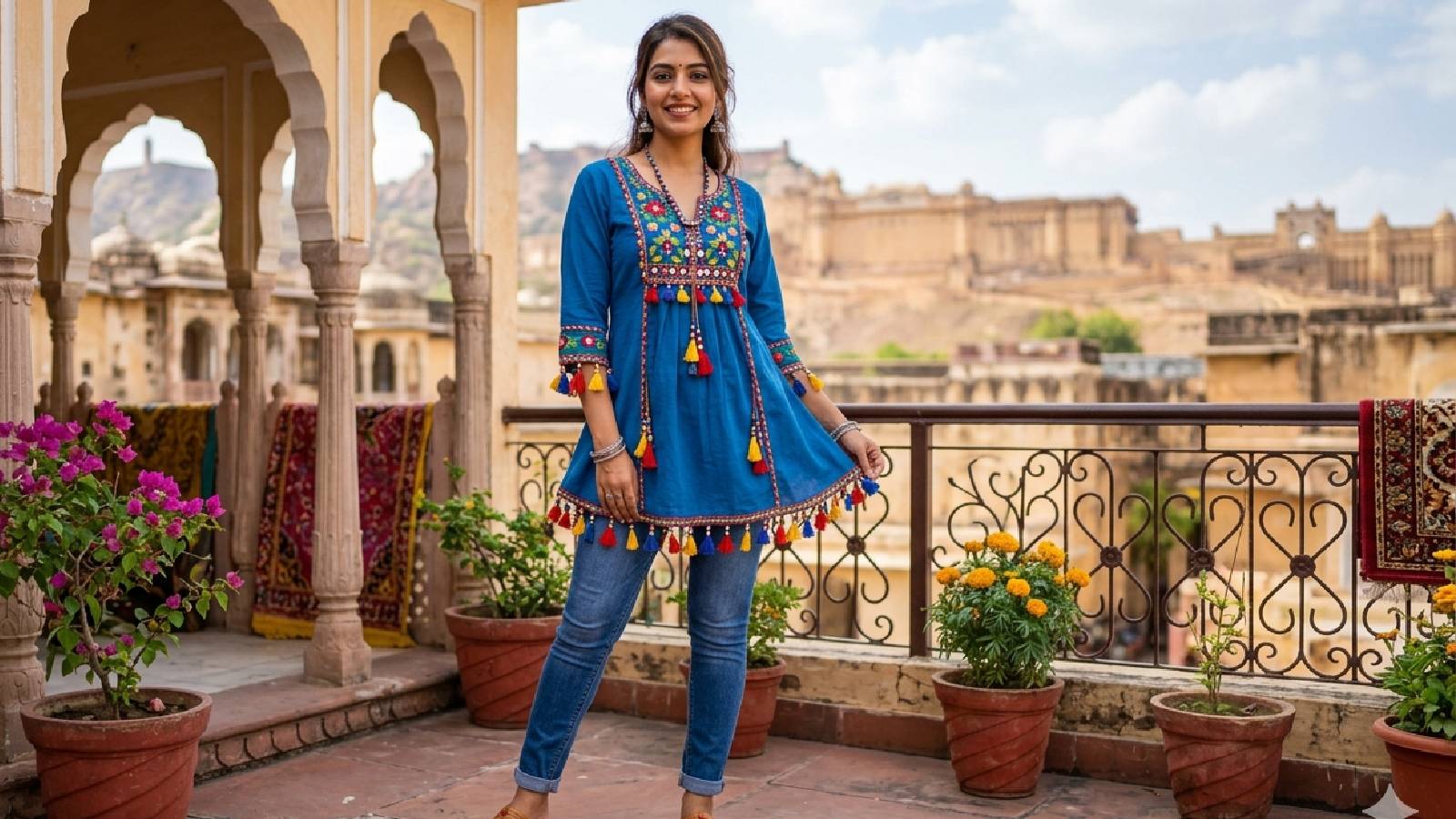 कुर्ती के पीछे डीप बैक और सफेद लेस टाइ दी गई है, जो कुर्ती को काफी स्टाइलिश और मॉडर्न लुक दे रही है। आप ऐसी कुर्ती के बॉर्डर में पॉम पॉम लटकन भी चुन सकती हैं, जो सुंदर दिखती हैं। साथ में ब्लू जींस जरूर के साथ पेयर करें। आपको ऐसी कुर्ती 300 रु के अंदर अमेजन, मीशो आदि वेबसाइट में मिल जाएंगी।