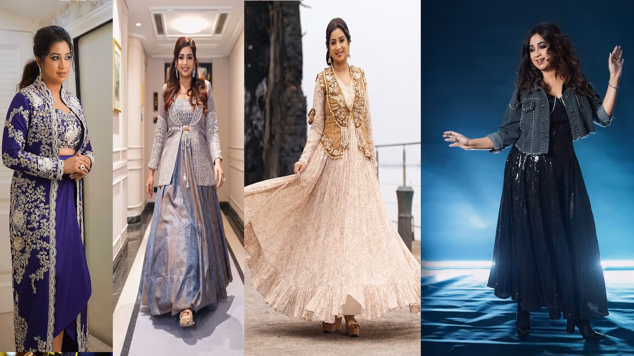 इस जैकेट ड्रेस में श्रेया का लुक बेहद फ्लोइंग और एलिगेंट नजर आ रहा है। लेयर्ड फ्लोर-लेंथ गाउन में अच्छा घेरा दिया गया है, जो आउटफिट को ग्रेसफुल बनाता है। इसके साथ सिंगर ने थ्रेड वर्क से सजा मैचिंग जैकेट कैरी किया है। दुपट्टा उनके इस लुक को और भी खूबसूरती से कंप्लीट कर रहा है। पर्व-त्योहार या वेडिंग फंक्शन में पहनने के लिए यह ड्रेस बेहतरीन ऑप्शन हो सकता है। इस तरह की ड्रेस पहनकर हैवी बॉडी टाइप वाली महिलाएं भी अपना फिगर स्लिम और ग्रेसफुल दिखा सकती हैं।