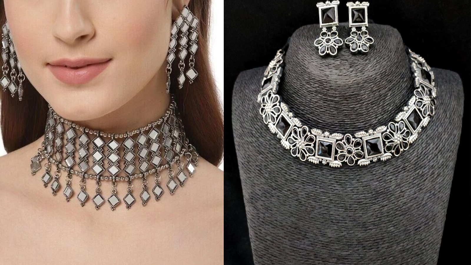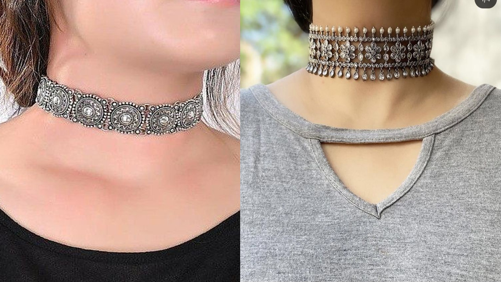 इन दोनों सिल्वर चोकर डिजाइंस की खूबसूरती एथनिक और मॉर्डन वियर दोनों पर खिलकर नजर आती है। पहला चोकर चौड़ी चैनिंग पर स्क्वायर शेप पेंडेंट और मोतियों की लटकन के साथ बनाया गया है, जो इसे रॉयल लुक देता है। वहीं दूसरा चोकर गोल बीड्स और फ्लोरल पेंडेंट के साथ डिजाइन किया गया है, जो बेहद एलीगेंट और सटल अपील देता है। साड़ी, सूट या वेस्टर्न आउटफिट दोनों ही पैटर्न हर मौके पर आपके स्टाइल को खास बना देंगे।
