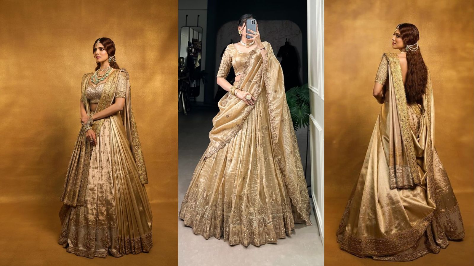 1. गोल्डन टिशू सिल्क पैटर्न हैवी एंब्रॉयडेड लहंगा