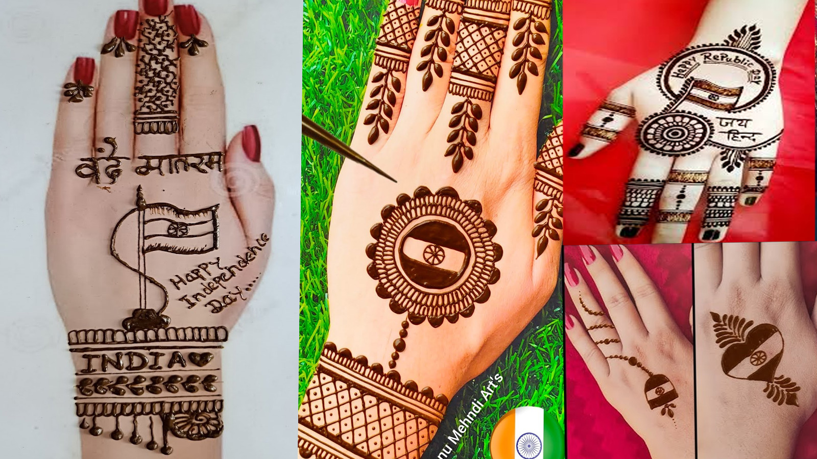 इस डिजाइन में हथेली के बीच हवा में लहराते हुए झंडे का आर्ट बनाया गया है। नीचे बड़े अक्षरों में 15 August लिखा गया है, जिससे यह तुरंत नजर खींचता है। किनारों और उंगलियों पर ट्रडिशनल बेल-बूटे और जाली पैटर्न इसे और खूबसूरत बनाते हैं। यह डिजाइन खासकर उन लोगों के लिए बेस्ट है जो मिनिमल लेकिन प्रभावशाली लुक चाहते हैं।