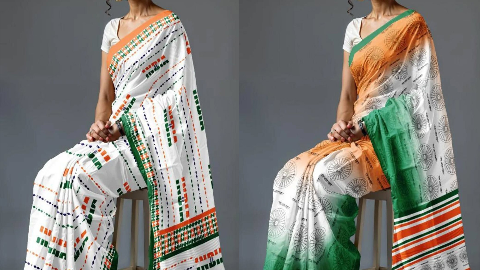 सफेद बेस पर केसरिया, हरे और नीले रंग के ज्योमेट्रिक व डॉट पैटर्न वाली पहली साड़ी हल्की कॉटन फैब्रिक से बनी है, जिसमें ग्रीन बॉर्डर और तिरंगे के रंगों का सुंदर मेल 15 अगस्त और 26 जनवरी जैसे मौकों के लिए परफेक्ट लुक देता है, वहीं दूसरी साड़ी तिरंगे के रंगों में ऑरेंज पल्लू, ग्रीन बॉर्डर और सफेद बीच में अशोक चक्र के प्रिंट के साथ देशभक्ति का शानदार अंदाज पेश करती है, जिसमें स्ट्राइप पैटर्न वाला बॉर्डर और सिल्क जैसी शाइन पारंपरिक व फेस्टिव दोनों लुक को एक साथ समेटे हुए है। ये तमाम साड़ी डिजाइंस आपको ऑनलाइन और मार्केट में मिल जाएंगे। कीमत की बात करें तो 500-2000 रुपए तक होगी।