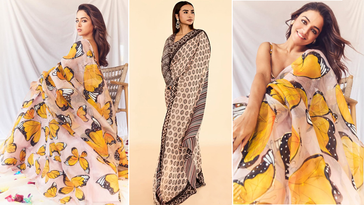 इस राखी पर फैब्रिक की बात हो तो ऑर्गेन्जा सबसे ऊपर है। डिजिटल फ्लोरल प्रिंट वाली ऑर्गेन्जा साड़ी बहुत ही एलीगेंट और ट्रेंडी लगती है। इसकी हल्की ट्रांसपेरेंसी और फ्लोइंग टेक्सचर, राखी के दिन की गर्मी में भी आपको स्टाइलिश और कंफर्टेबल बनाएगी। आप इसे स्लीवलेस या बोट नेक ब्लाउज के साथ पेयर करें। साथ में मिनिमल ज्वेलरी पेयर करें।