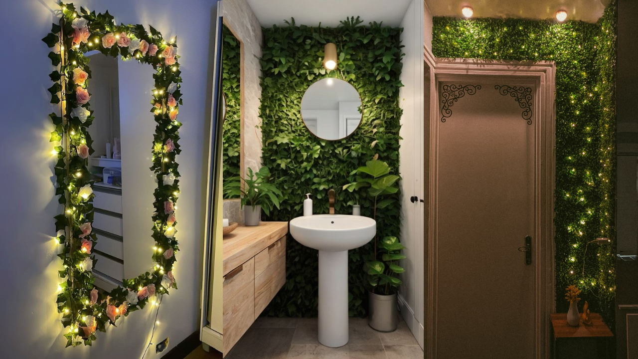 कमरे में ग्रास लगाने की जगह नहीं है तो दीवार पर लगे शीशे को डेकोरेट करें। इसमें घास और प्लास्टिक फूलों की बेल बनाकर मिरर सजाएं, साथ में वार्म LED लाइट इसे एस्थेटिक लुक दे रही हैं।