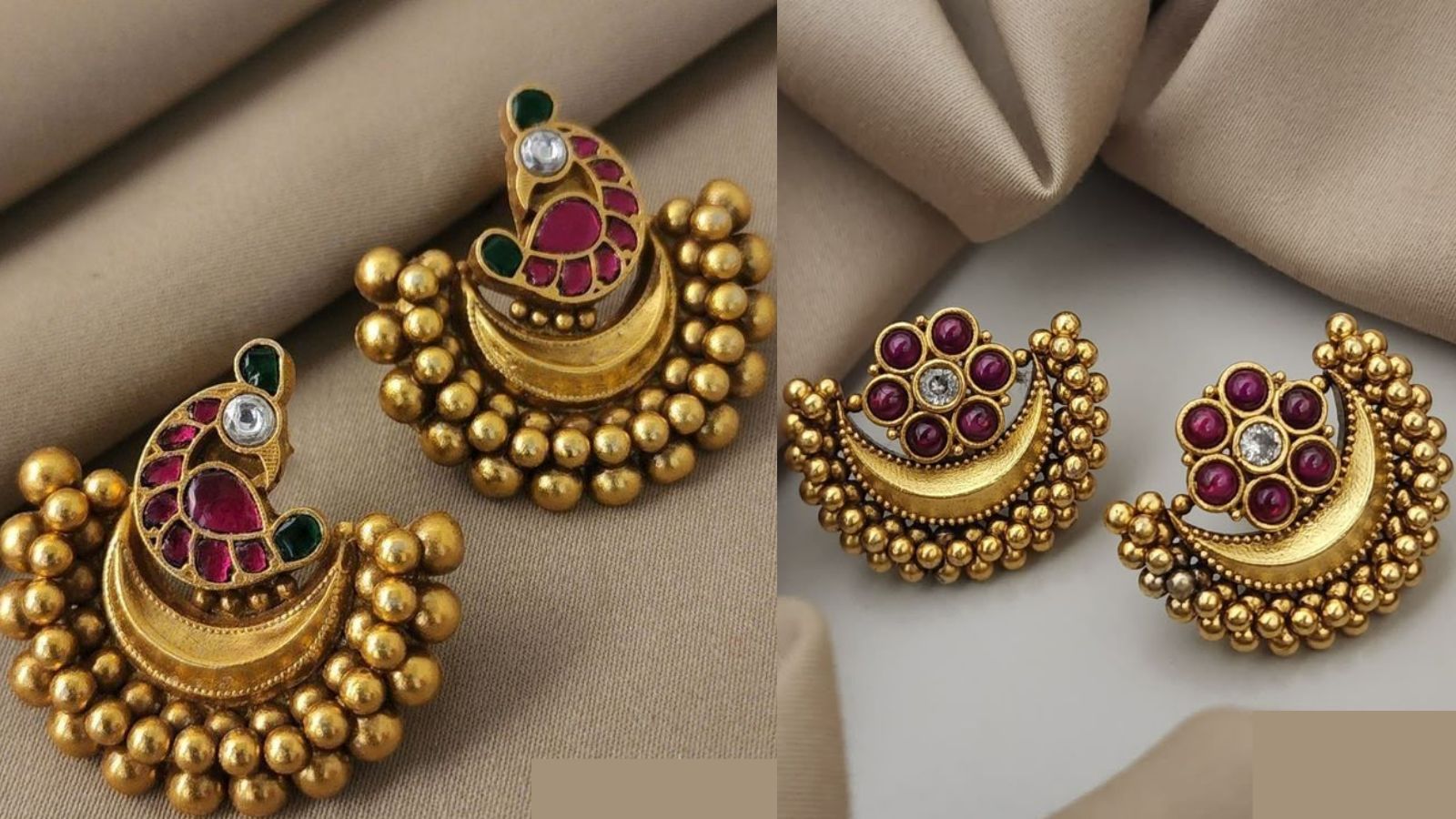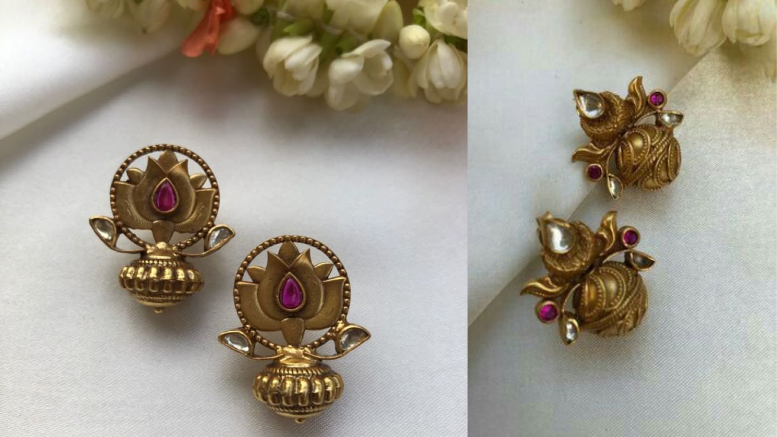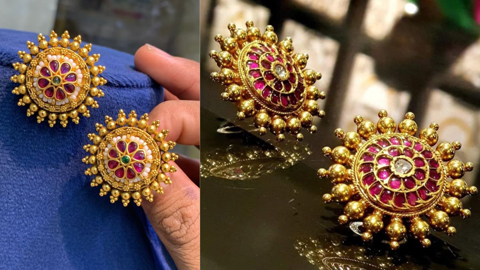 साउथ इंडियन ज्वेलरी अपने स्टोन्स और गोल्डवर्क के लिए जानी जाती है। इन गोल्ड स्टड्स में पिंक स्टोन को सेंटर में लगाया जाता है जो बेहद आकर्षक लगता है। ये स्टड 6 से 8 ग्राम में भी आ सकते हैं और फेस्टिव मौकों के लिए एकदम परफेक्ट हैं।
