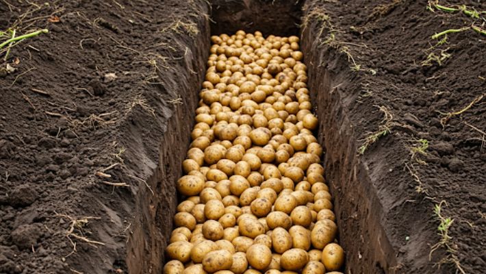 गड्ढे में नीचे सूखी घास या भूसा बिछाया जाता है, फिर आलू की परतें डाली जाती हैं और ऊपर से फिर मिट्टी और घास से ढक दिया जाता है। इससे आलू नमी से बचे रहते हैं और खराब नहीं होते।