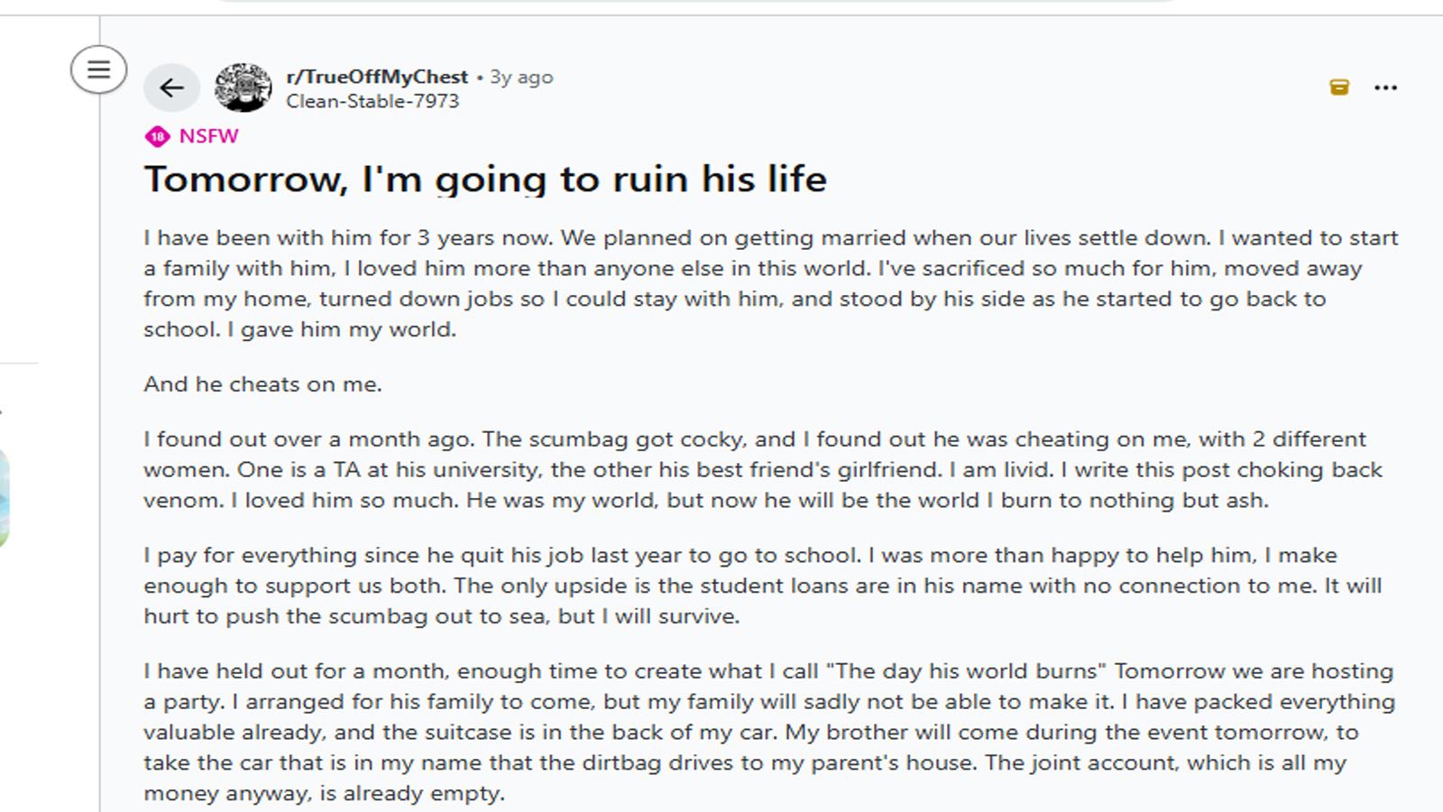 मेकअप क्रिएटर और सोशल-इंसाइट क्रिएटर Tatty (टैटी लोमस) ने अपने सोशल मीडिया पर इस स्टोरी को शेयर करते हुए बताया कि वो एक लड़के साथ 3 साल से रिश्ते में थी। वो उससे बहुत प्यार करती थी और शादी के बंधन में बंधने की योजना बना रही थी। लेकिन एक दिन उसे पता चला कि उसका अफेयर दो और लड़कियों के साथ चल रहा है। उनमें से एक उसकी यूनिवर्सिटी में टीचिंग असिस्टेंट है और दूसरी उसके सबसे अच्छे दोस्त की गर्लफ्रेंड है।