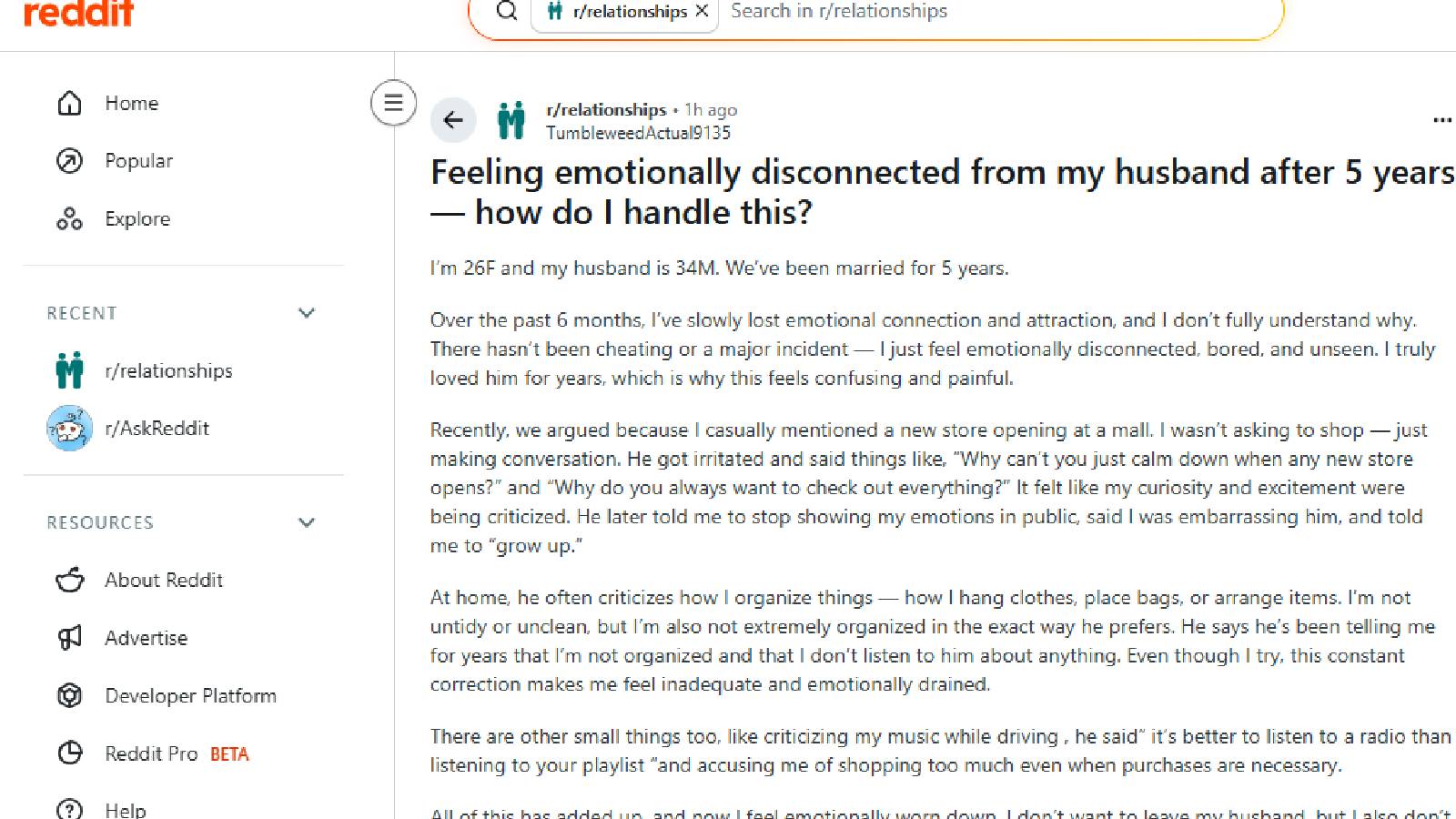 हर रिश्ते को बचाने की जरूरत नहीं होती। कभी-कभी, सबसे बहादुर फैसला खुद को चुनना होता है - चाहे वह कितना भी डरावना क्यों न लगे। अगर बातचीत, समझ और सम्मान के मौके बार-बार कम हो रहे हैं, तो खुद से यह पूछना बहुत जरूरी है: क्या यह रिश्ता मुझे एक बेहतर इंसान बना रहा है, या यह बस मुझे थका रहा है? आइए जानते हैं इसे लेकर लोगों की क्या राय है- एक यूजर ने लिखा इससे निपटने का सबसे हेल्दी तरीका काउंसलिंग है। सच कहूं तो ऐसा लगता है कि उसे तुम्हारी जवानी तब पसंद थी जब तुम आसानी से कंट्रोल हो जाती थी, लेकिन अब जब उसे तुम्हें कंट्रोल करना मुश्किल लग रहा है, तो तुम्हारी जवानी वाली आदतें उसे परेशान करती हैं। एक अन्य ने लिखा ऐसा नहीं लगता कि वह तुम्हें पसंद करता है। वह बुरा और अपमान करने वाला है।