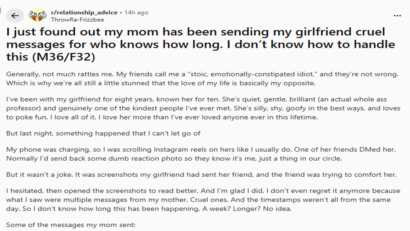 लेकिन हाल ही में मुझे एक ऐसा सच पता चला जिसने मेरे अंदर तक हिला कर रख दिया। मुझे पता चला कि मेरी मां मेरी गर्लफ्रेंड को लंबे समय से गंदे, अपमानजनक और तकलीफदेह मैसेज भेजती रही है। अब मैं समझ नहीं पा रहा हूं कि इस स्थिति को कैसे संभालूं। इस दर्द में घिरा युवक अपनी कहानी दुनिया के सामने रखकर सलाह मांग रहा है ताकि वह सही कदम उठाकर अपनी पार्टनर को ठीक तरह सपोर्ट कर सके। शख्स ने रेडिट पर पूरा वाकया बताया और पूछा कि मुझे ऐसी स्थिति में क्या करना चाहिए।
