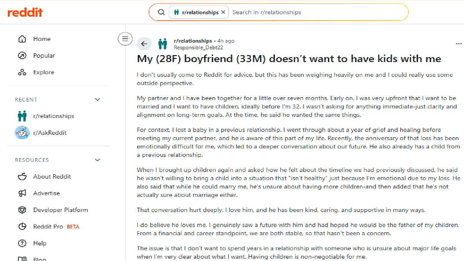 रेडिट पर लड़की स्टोरी परढ़कर लोगों नेअपनी देते हुए कहा कि वह तुमसे शादी नहीं करना चाहता था, इसलिए वह कभी नहीं करेगा। वह तुम्हारे साथ बच्चे नहीं चाहता, इसलिए वह कभी नहीं चाहेगा। तुम शादी करना चाहती हो। तुम बच्चे चाहती हो। लेकिन यह उसके साथ नहीं होगा। एक अन्य ने कहा कि 7 महीने और वह पहले से ही ज़िंदगी के बड़े लक्ष्यों से पीछे हट रहा है? यह अपने आप में काफी साफ जवाब है - जब कोई आपको दिखाता है कि वह कैसा है, तो पहली बार में ही उस पर विश्वास करें।