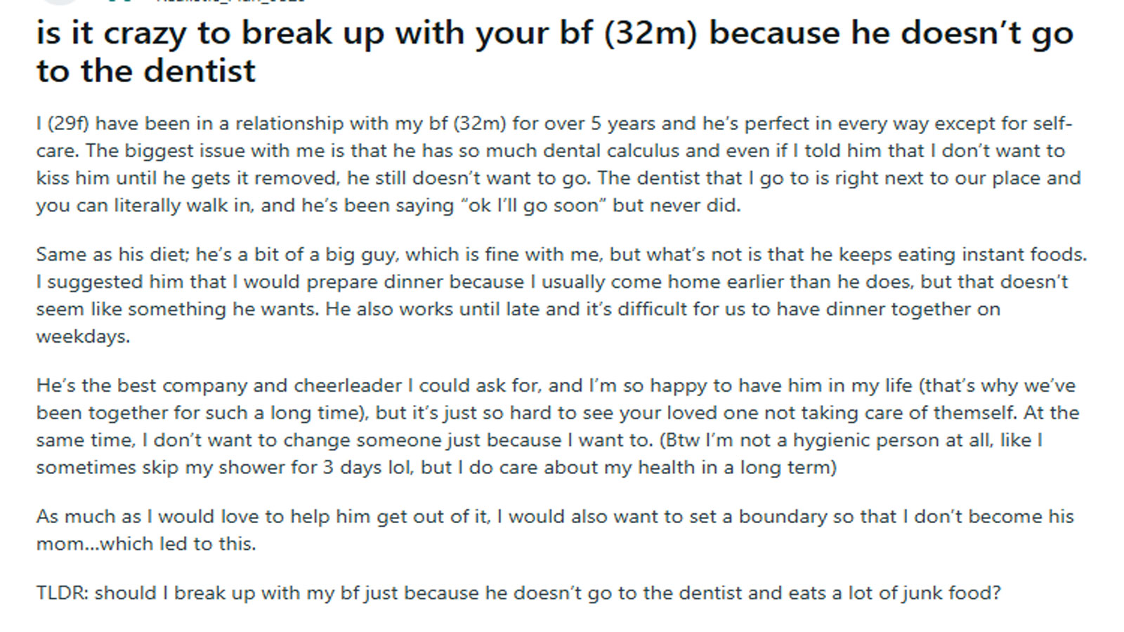 29 साल की लड़की ने रेडिट पर लिखा,' पिछले 5 साल से अपने 32 साल के बॉयफ्रेंड के साथ रिलेशनशिप में हूं। वह हर मायने में परफेक्ट है, बस सेल्फ केयर को छोड़कर। मेरी सबसे बड़ी समस्या उसकी डेंटल हेल्थ को लेकर है। उसके दांतों में काफी ज्यादा कैल्कुलस (जमी गंदगी) है और मैंने साफ कहा कि जब तक वह इसे साफ नहीं करवाता, मैं उसे किस नहीं करना चाहती। इसके बावजूद वह डेंटिस्ट के पास जाने को टालता रहता है।
