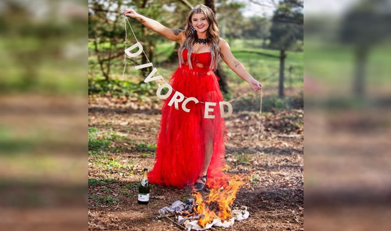 पीड़ा देने वाले रिश्ते से निकलने के बाद अमेरिकी महिला ने फोटोशूट कराया। जिसमें वो अपनी शादी की ड्रेस को जलाते हुए नजर आ रही हैं। वहीं कुछ तस्वीरों में वो शादी की फोटोज फाड़ रही हैं।